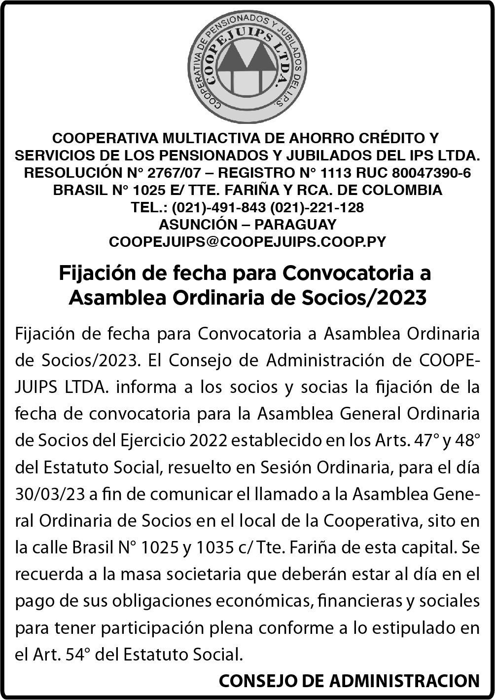cos Titulares, Suplentes y fijación de sus retribuciones. 5- Elección de un accionista para firmar el acta de asamblea, junto al Presidente y Secretario de la asamblea. EN CASO DE FALTA DE QUÓRUM EN LA PRIMERA CONVOCATORIA, LA SEGUNDA CONVOCATORIA SE REALIZARÁ AUTOMATICAMENTE UNA HORA DESPUÉS. SE RECUERDA A LOS SEÑORES ACCIONISTAS LA OBLIGACIÓN ESTATUTARIA Y LEGAL SOBRE EL DEPÓSITO EN LA SOCIEDAD DE LAS ACCIONES, O UN CERTIFICADO BANCARIO O DE OTRA INSTITUCIÓN ANÁLAGO DE DEPÓSITO LIBRADO PARA EL EFECTO, CON TRES DÍAS HÁBILES DE ANTICIPACIÓN A LA FECHA DE CELEBRACIÓN DE LA ASAMBLEA, COMO REQUISITO PARA PARTICIPAR EN LA MISMA. EL DIRECTORIO.-46259/27/03.CONVOCATORIA DE ASAMBLEA GENERAL ORDINARIA. DE CONFORMIDAD AL ARTÍCULO 1 079 DEL CÓDIGO CIVIL Y A LOS ESTATUTOS SOCIALES, EL DIRECTORIO DE “CALCIS SOCIEDAD ANÓNIMA” CONVOCA A LOS SEÑORES ACCIONISTAS A LA ASAMBLEA GENERAL ORDINARIA DE ACCIONISTAS, A REALIZARCE EN EL LOCAL SOCIAL, SITO EN EL KM 8 AV. MONSEÑOR RODRIGUEZ, EDIF. HISPANIA 1, PISO 9, DE CIUDAD DEL ESTE, DPTO. ALTO PARANÁ, REPÚBLICA DEL PARAGUAY, EL DÍA 12 ABRIL DE 2023 A LAS 15:00 HORAS, A LOS EFECTOS DE TRATAR EL SIGUIENTE ORDEN DEL DÍA: 1- Designación de un Presidente y un Secretario de Asamblea. 2- Lectura y Consideración del Balance General, Cuadro demostrativo de Pérdidas y Ganancias, Informe del Síndico y Memoria del Directorio correspondiente al ejercicio cerrado al 31 de diciembre de 2022 3Elección de Directores Titulares y Suplentes. 4- Designación de Síndicos Titulares y Suplentes. 5- Remuneración de los Directores y Síndicos. 6- Designación de accionistas que suscriban el Acta de Asamblea conjuntamente con el Presidente y el Secretario. EN CASO DE FALTA DE QUÓRUM EN LA PRIMERA CONVOCATORIA, LA SEGUNDA CONVOCATORIA SE REALIZARÁ AUTOMÁTICAMENTE UNA HORA DESPUÉS. SE RECUERDA A LOS SEÑORES ACCIONISTAS LA OBLIGACIÓN ESTATUTARIA Y LEGAL SOBRE