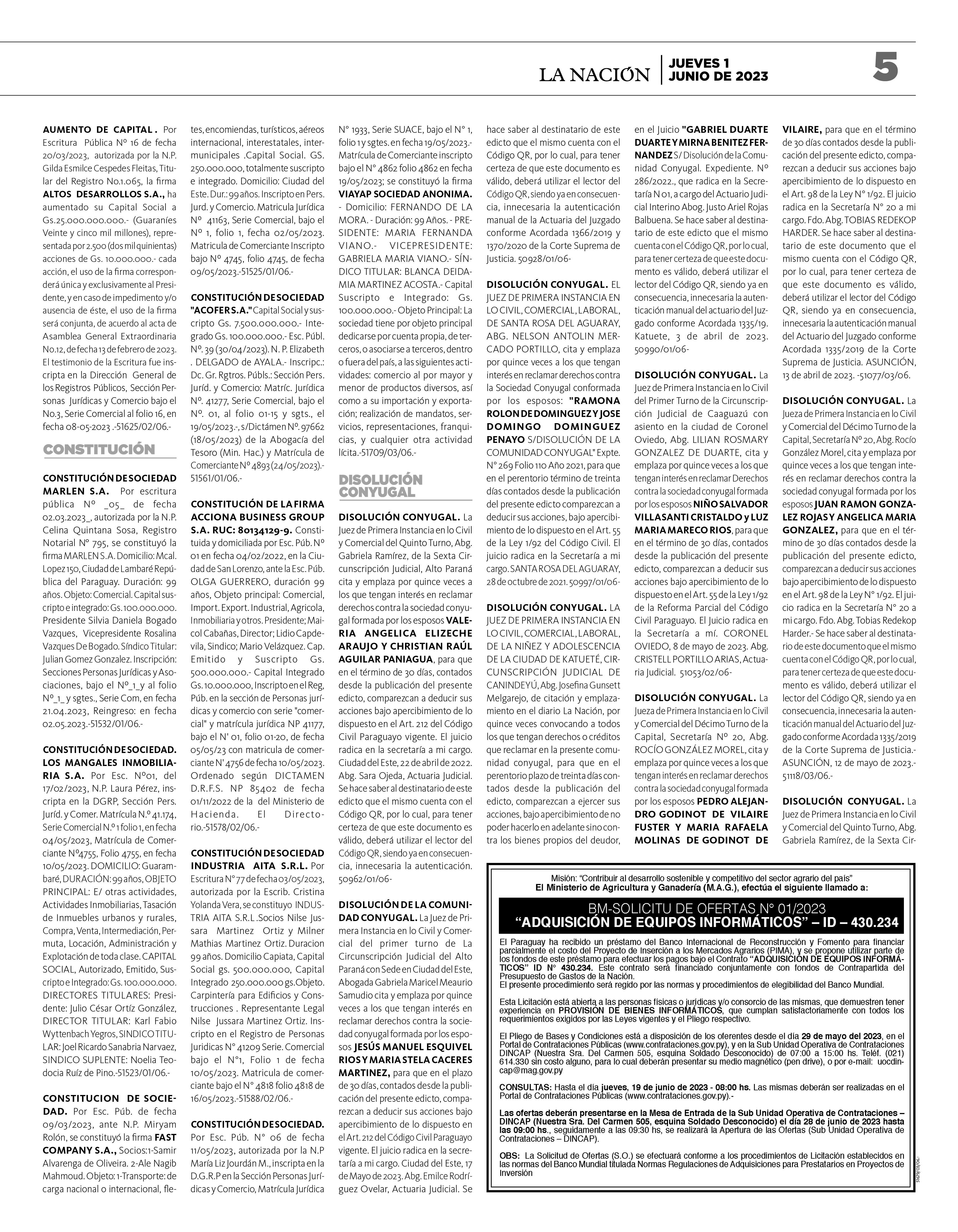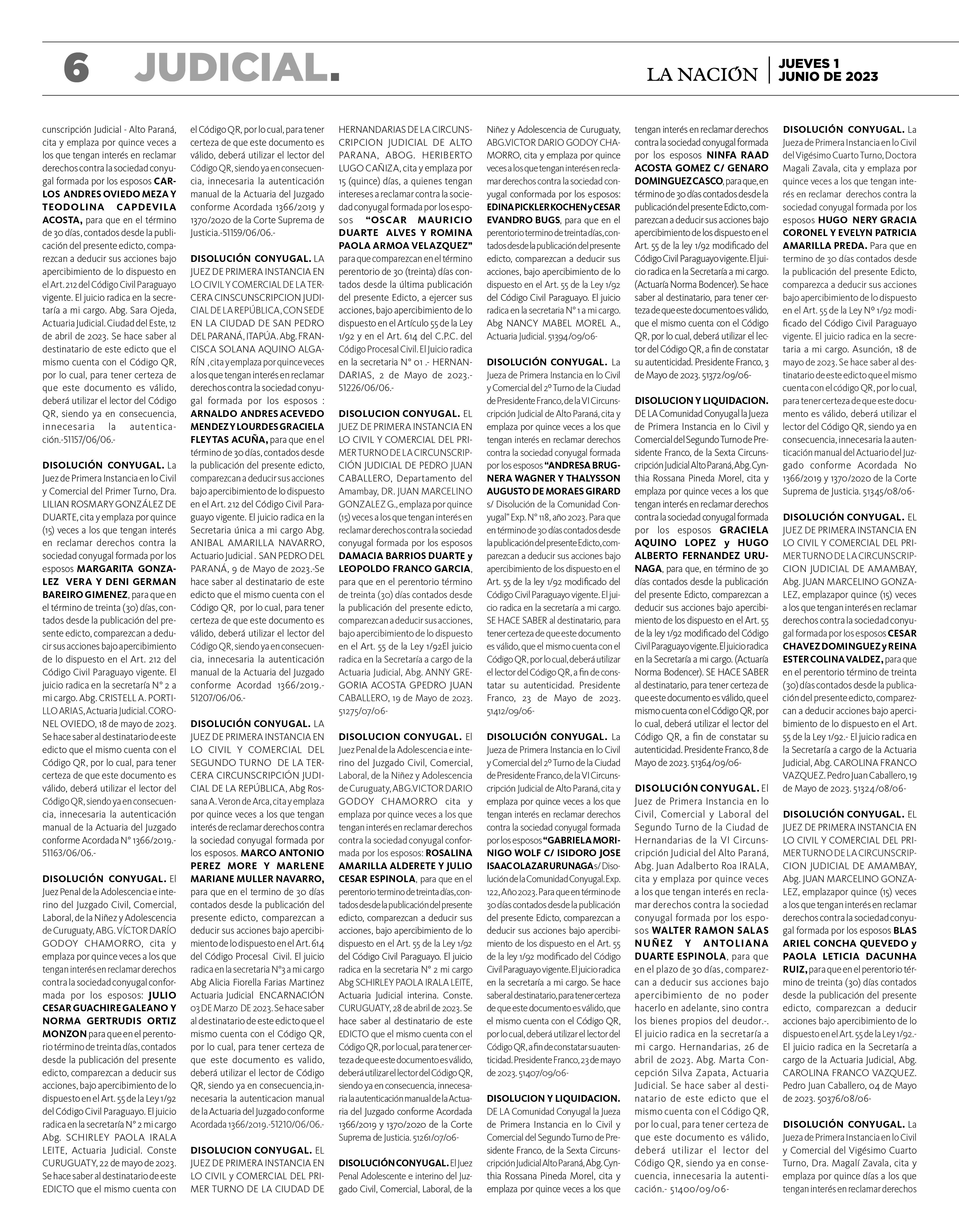 CION ARCE VDA DE GOMEZ DE LA FUENTE Y OTROS Asunción, 1 de octubre de 2021. Se hace saber al destinatario de este mandamiento que el mismo cuenta con el código QR, por lo cual, para tener certeza de que este documento es válido, deberá utilizar el lector del Código QR, siendo ya en consecuencia, innecesaria la autenticación manual del Actuario del Juzgado conforme Acordada No 1366/2019 y 1370/2020 de la Corte Suprema de Justicia. 51306/03/06SUCESIÓN. EL JUEZ DE PRIMERA INSTANCIA EN LO CIVIL Y COMERCIAL DEL SEGUNDO TURNO DE LA CIRCUNSCRIPCIÓN JUDICIAL DE VILLARRICA, Abg. OSCAR ALFREDO ORTEGA VARELA, en los autos caratulados: “DAMIANA ORTELLADO VDA. DE MARTINEZ S/ SUCESIÓN INTESTADA”, cita y emplaza por sesenta días a los que tengan interés en reclamar derechos contra la sucesión de la Sra. DAMIANA ORTELLADO MARTINEZ. - El juicio radica en la secretaría a mi cargo. ANTE MÍ: Abg. CELSO ARIEL BENITEZ. ACTUARIO. VILLARRICA, 19 de mayo de 2023. 51355/03/06SUCESIÓN. LA JUEZA DEL JUZGADO DE PAZ EN LO CIVIL, COMERCIAL, LABORAL, PENAL Y DE LA NIÑEZ Y LA ADOLESCENCIA, DE LA CIUDAD DE SANTA ROSA DEL MBUTUY, ABOGADA LIZZA DANELIA SUBELDIA PIRAGGINI, DE LA CIRCUNSCRIPCION JUDICIAL DE CAAGUAZÚ, en los autos caratulados: "MARIA DEL ROSARIO GIMENEZ DE GONZALEZ S/ SUCESIÓN.- ANO: 2.023.- Nº 05.- FOLIO Nº 01" Cita y Emplaza, por el término de 10 (Diez) dias a herederos y acreedores de la Sucesión de: "MARIA DEL ROSARIO GIMENEZ DE GONZALEZ", para que en el plazo de 60 (Sesenta) días, contados desde la primera publicación, concurran a ejercer sus derechos. El Juicio radica en la Secretaría Nº 1, a cargo del Abogado RAMÓN CAÑETE CONTRERAS. Santa Rosa del Mbutly, 02 de mayo de 2.003.Ante mí: Abg. RAMON CANETE CONTRERAS, Actuario Judicial.