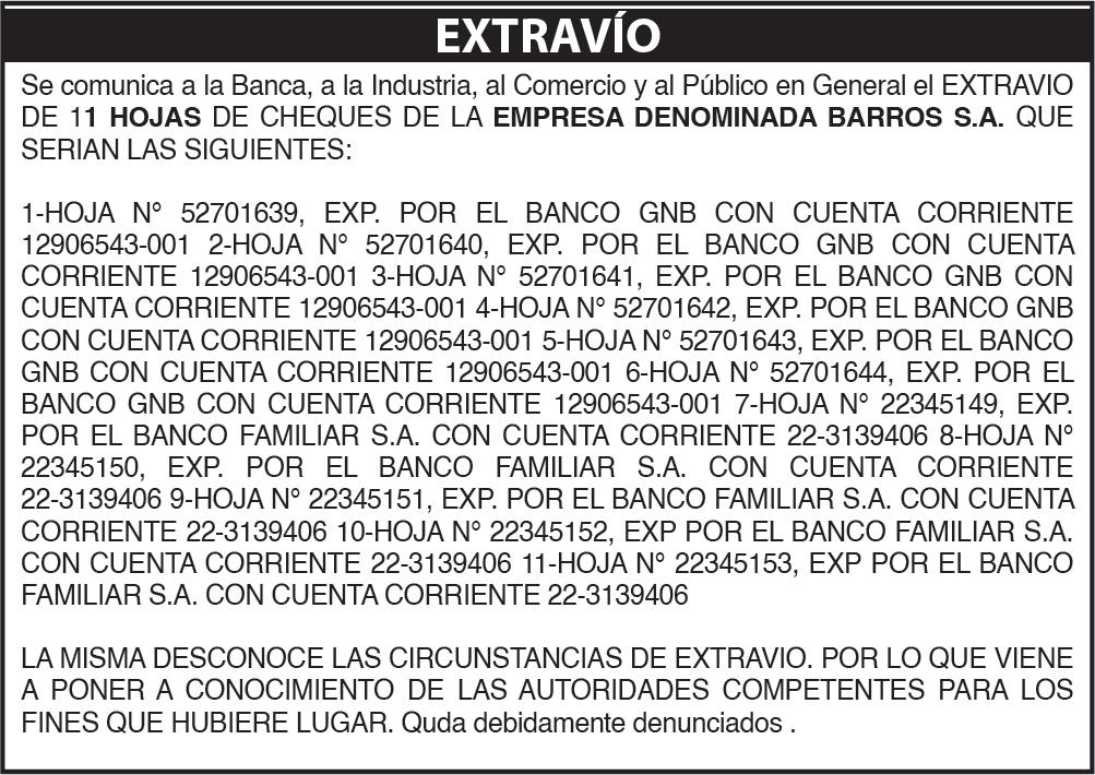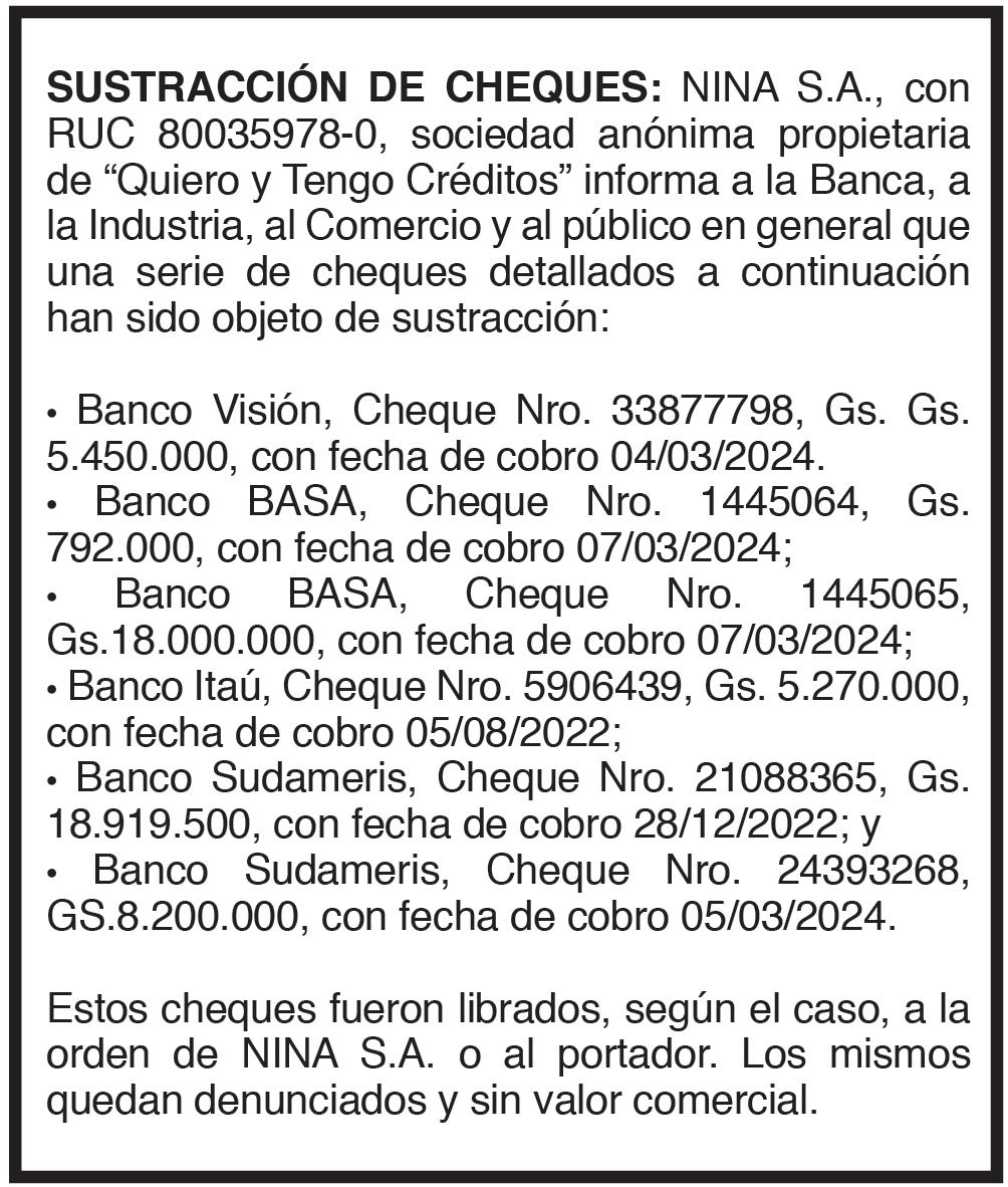 tados y el Informe del Síndico correspondientes al ejercicio cerrado el 31 de diciembre de 2023 3- Destino del Resultado del Ejercicio. 4-Destino de las Reservas de Revalúo y Facultativa. 5-Remuneración de los Directores y Síndicos. 6-Designación de accionistas para firmar el Acta de Asamblea. Se recuerda a los señores accionistas que para participar de las asambleas deberán dar cumplimiento a lo establecido en los estatutos sociales referente al depósito de las acciones. Asunción, 06 de marzo de 2024 EL DIRECTORIO.-64532/11/03.-