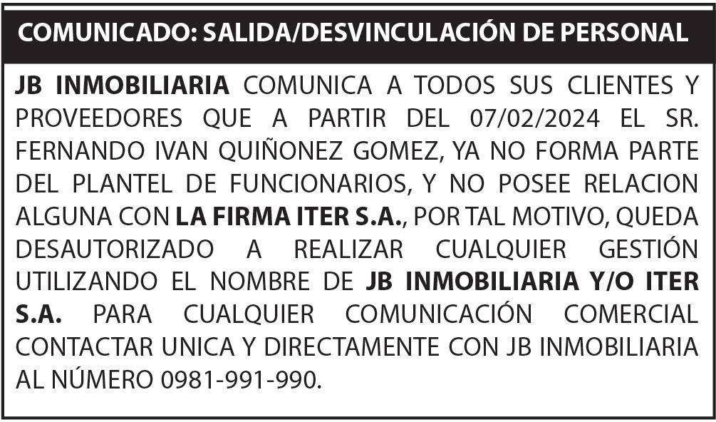 sucesión de JUAN LUIS ROJAS ALUM. El juicio radica en la Secretaría 48 a cargo del Actuario Judicial Carlos Galeano Aranda. Asunción, 26 de febrero de 2024. Se hace saber al destinatario de este Edicto que el mismo cuenta con el Código QR, por lo cual, para tener certeza de que este documento es válido, deberá utilizar el lector del Código QR, siendo ya en consecuencia innecesaria la autenticación manual del Actuario del Juzgado, conforme Acordadas 1366/2019 y 1370/2020 de la Excma. Corte Suprema de Justicia. Firmado digitalmente por: Carlos Galeano Aranda (Actuario). 63993/08/03-