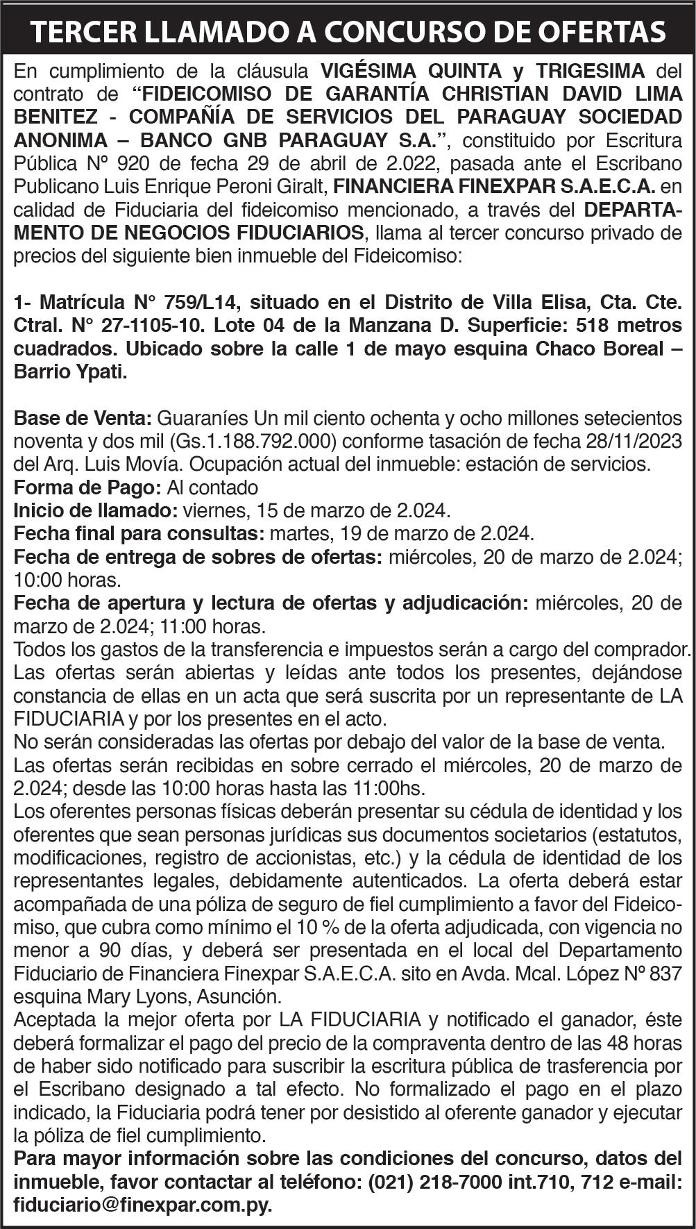 blea General Ordinaria de Accionistas para el día 29 de marzo de 2024, a las 10:30 horas en el local social, sito en la calle Bulnes casi Av. España N° 830 de la ciudad de Asunción, para tratar el siguiente: ORDEN DEL DÍA: 1) Elección de un Presidente y Secretario de Asamblea. 2) Lectura y Consideración de la Memoria Anual del Directorio, Del Balance General y el Cuadro de Resultados, Estado de Variación del Patrimonio Neto, Estado de Flujo de Efectivo, el Anexo al cálculo de la Utilidad Comercial, y el Informe del Síndico, correspondiente al ejercicio fiscal fenecido del año 2023. 3) Elección del Directorio, Representante Legal y sus remuneraciones. 4) Elección del Síndico y sus remuneraciones. 5) Destino de las Utilidades. 6) Emisión de nuevas acciones. 7) Designación de un accionista para suscribir el acta de asamblea. El directorio comunica que la segunda convocatoria de esta asamblea queda ijada para una hora después de la establecida para la primera, de conformidad con lo dispuesto en los estatutos sociales. Se recuerda, asimismo, a los accionistas el depósito de acciones para tener derecho de asistencia a la asamblea. EL DIRECTORIO.-65192/20/03.-