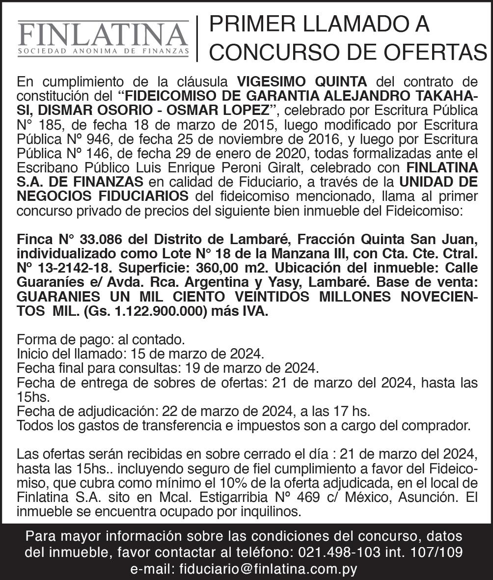 CONVOCATORIA A ASAMBLEA GENERAL ORDINARIA. De conformidad a los Estatutos Sociales, FLUODER S.A. convoca a Asamblea General Ordinaria de accionistas para el día 3 de abril de 2024, a realizarse en la sede social de la sociedad, sito en la calle Cnel. Carlos Bóveda N° 5614 y Tte Alejandro Monges de la ciudad de Asunción, a las 8:00 horas, en Primera Convocatoria y a las 9:00 horas, en Segunda Convocatoria, pudiendo realizarse válidamente la Asamblea en Segunda Convocatoria, con cualquier cantidad de asistentes y de acciones representantes, según lo dispone el Art 16 de los Estatutos Sociales. El orden del día a ser tratado será el siguiente:
