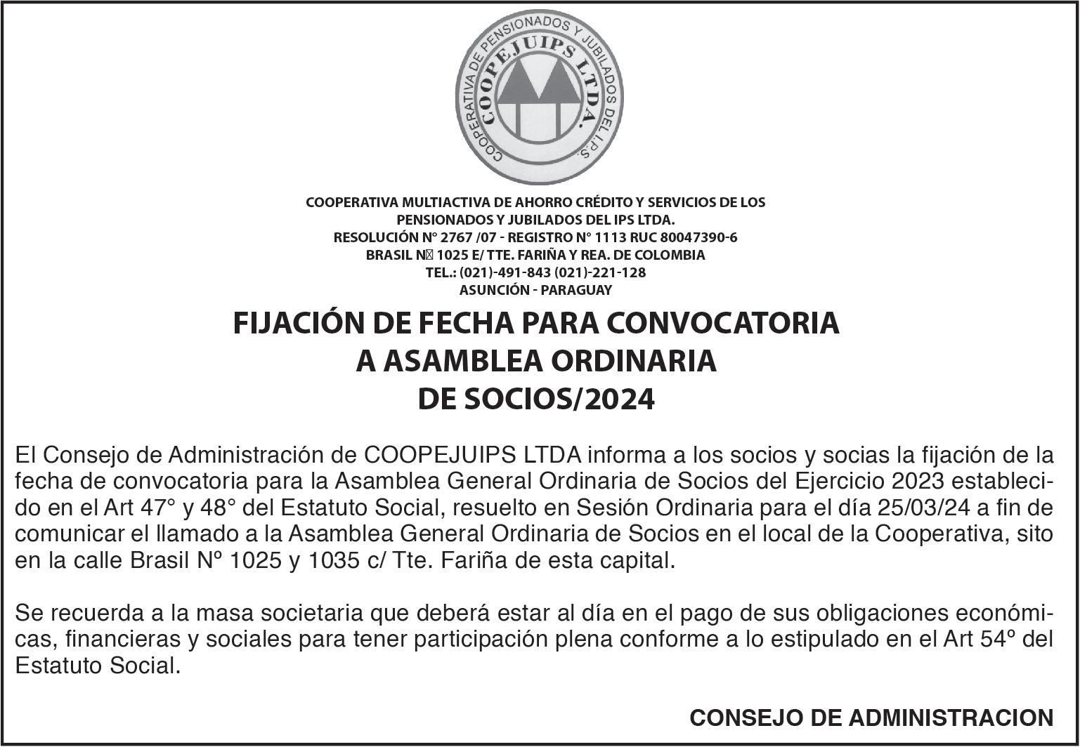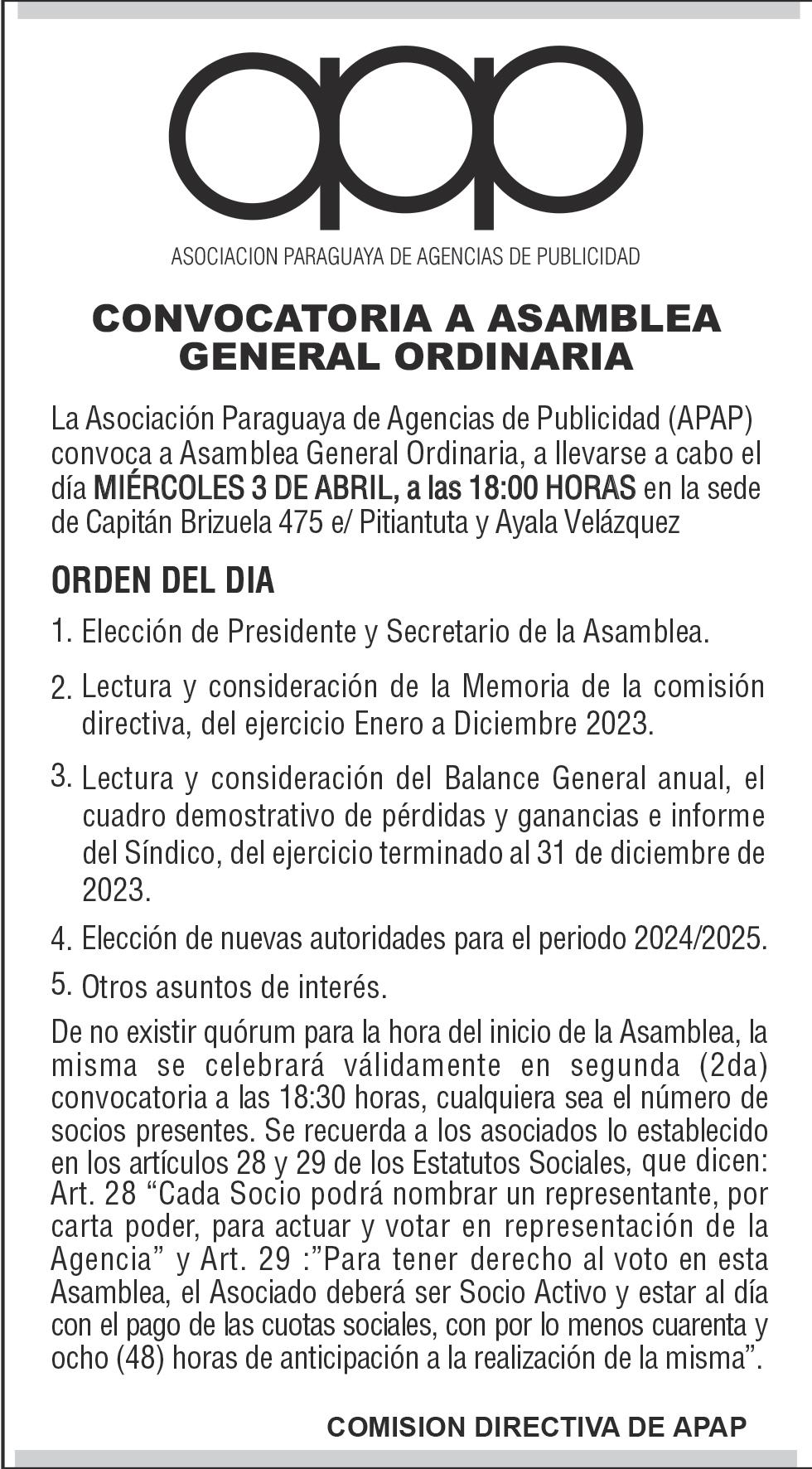 CONVOCATORIA A ASAMBLEA GENERAL ORDINARIA. De conformidad a lo establecido en los Estatutos Sociales, la Junta Directiva de la CÁMARA PARAGUAYA DE MEDIOS DE PAGO, convoca a Asamblea General Ordinaria a llevarse a cabo el día miércoles 03 de abril del corriente año, a partir de las 15:00 hs. en su primera convocatoria, en la Sala de Reuniones 1 del Hub Hotel Asunción, sito en Eulogio Estigarribia esquina Tte. Rodolfo Zotti. Si no hubiere quórum una hora después de la hora fijada, la Asamblea se constituirá con cualquier número de Socios presentes, para tratar el siguiente: ORDEN DEL DÍA 1. Elección del Secretario de Asamblea. 2. Lectura y consideración de la Memoria de la Junta Directiva, Balance General y Cuadro de Resultados, Informe y Dictamen del Síndico, correspondiente al Ejercicio comprendido entre el 01 de enero de 2023 y el 31 de diciembre del 2023. 3. Elección de Miembros para la conformación de la Junta Directiva. 4. Elección de Síndico Titular y Suplente. 5. Elección de dos Miembros para suscribir el Acta de Asamblea. Se recuerda a los Socios lo establecido en el art. 12 del Estatuto Social. -64967/22/03.-