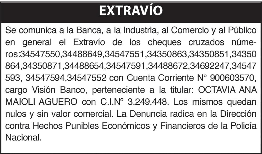 ASAMBLEA GENERAL ORDINARIA. De conformidad a lo dispuesto en el Art. 23 de los Estatutos Sociales y al Art. 1078 y 1079 del Código Civil Paraguayo, se convoca a los Accionistas de la firma PARANÁ MULTISERVICE S.A. a la Asamblea General Ordinaria a realizarse el día 05 de Abril de 2024 a las 09:00 Hs, primera convocatoria y segunda convocatoria a las 10:30 hs., en el