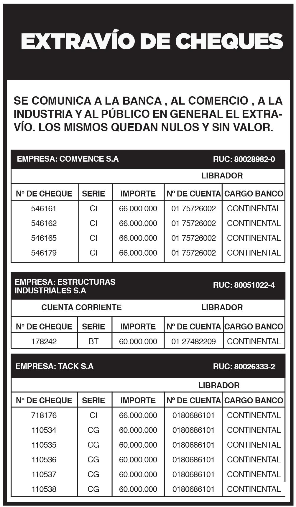 Se comunica a la Banca, a la Industria, al Comercio y al Público en general el extravío de un cheque con número de serie CJ-51841 a pagar a la orden del Señor Basilio Enriquez, del Banco Continental, cuenta numero 23-7114000/0 con fecha de emisión del 14/03/2024 por el importe de 1.264.454 guaraníes. La misma queda sin ningún valor comercial. 65566/05/04.-