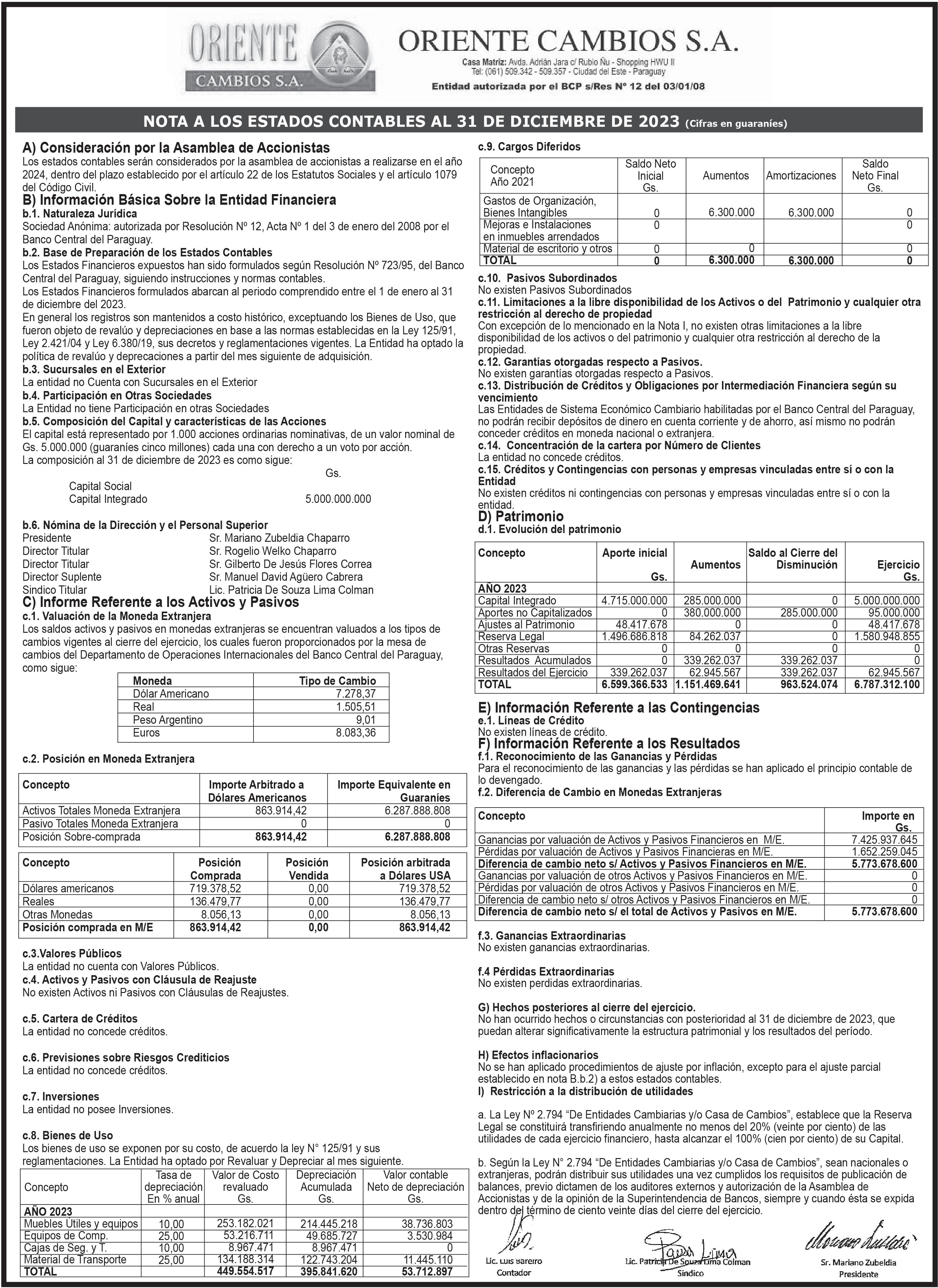 7-Designación del accionista para firmar el acta de Asamblea. Se recuerda a los Señores Accionistas, que deberán depositar sus acciones en la sede de la sociedad con 3 días de anticipación para tener derecho de asistencia a la Asamblea (Art. 26 de Estatutos Sociales).Asunción, 25 de marzo de 2024 EL DIRECTORIO. -65984/05/04.-