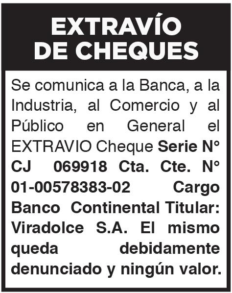 Se comunica a la banca, la industria, al comercio, y al público en general el extravío de 1 hoja de Factura legal Nº 003-002-0008229 el original, duplicado y triplicado con timbrado Nº 16743938 a Nombre de la empresa K & K SHOPPING’S S.A. con RUC Nº 80054222-3. Ocurrido en fecha 04/03/2024, la misma queda nula y sin ningún valor fiscal. 66708/06/04.- 66756/07/04.-