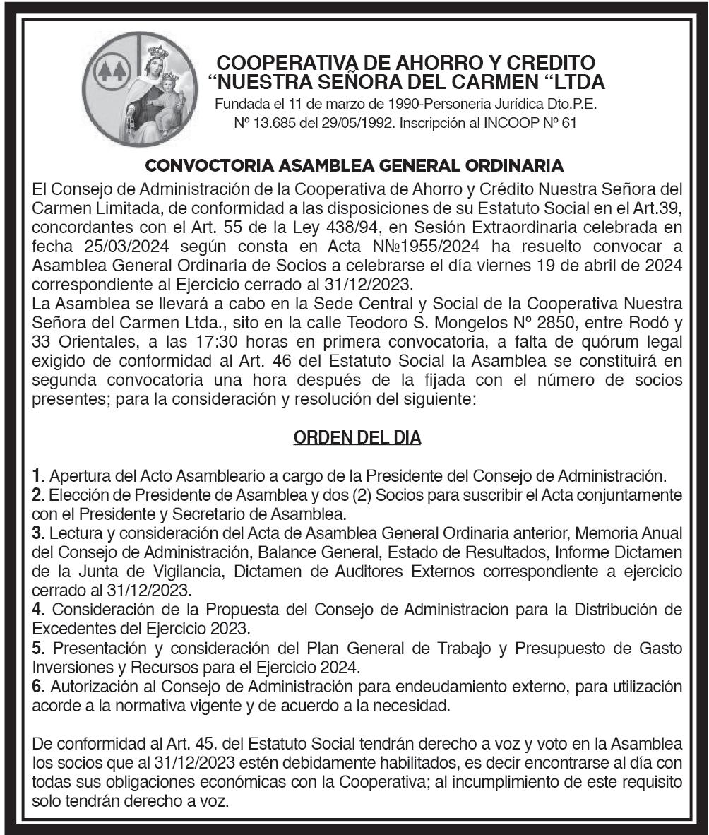 CONVOCATORIA A ASAMBLEA GENERAL ORDINARIA. El Consejo de Administración de la COOPERATIVA BINACIONAL DE SERVICIOS CABAL PARAGUAY LIMITADA en su sesión de fecha 01 de marzo de 2024, de acuerdo a lo establecido en los artículos 11 y 14 del Estatuto Social, convoca a la Asamblea General Ordinaria, a llevarse a cabo el día viernes 19 de Abril de 2024, a las 15:00 horas, en el local de Cabal Cooperativa de Provisión de Servicios Ltda., sito en la calle Lavalle N° 341 de Capital Federal ciudad de Buenos Aires – República Argentina, para tratar el temario que se detalla a continuación. Orden del Día: 1) Designación del Presidente y Secretario de la Asamblea. 2) Designación de los representantes de las socias para suscribir el Acta de Asamblea en su carácter de delegados. 3) Consideración de la Memoria del Consejo de Administración, del Balance General, Balance de Sumas y Saldos y Cuadro de Resultados, dictaminados por la Junta de Vigilancia y la Auditoria Externa, correspondientes al ejercicio comprendido entre el 1 de Enero y el 31 de Diciembre de 2.023. 4) Propuesta de Distribución de Excedentes. 5) Consideración del Plan General de Trabajo para el ejercicio 2.024. 6) Consideración del Presupuesto General de Gastos, Inversiones y Recursos para el Año 2.024. Designación, reconfirmación o modificación por parte de las socias de sus representantes en el Consejo de Administración y Junta de Vigilancia conforme lo establece el Art. 17 y el Art. 26 de los Estatutos Sociales. -66555/18/04.-