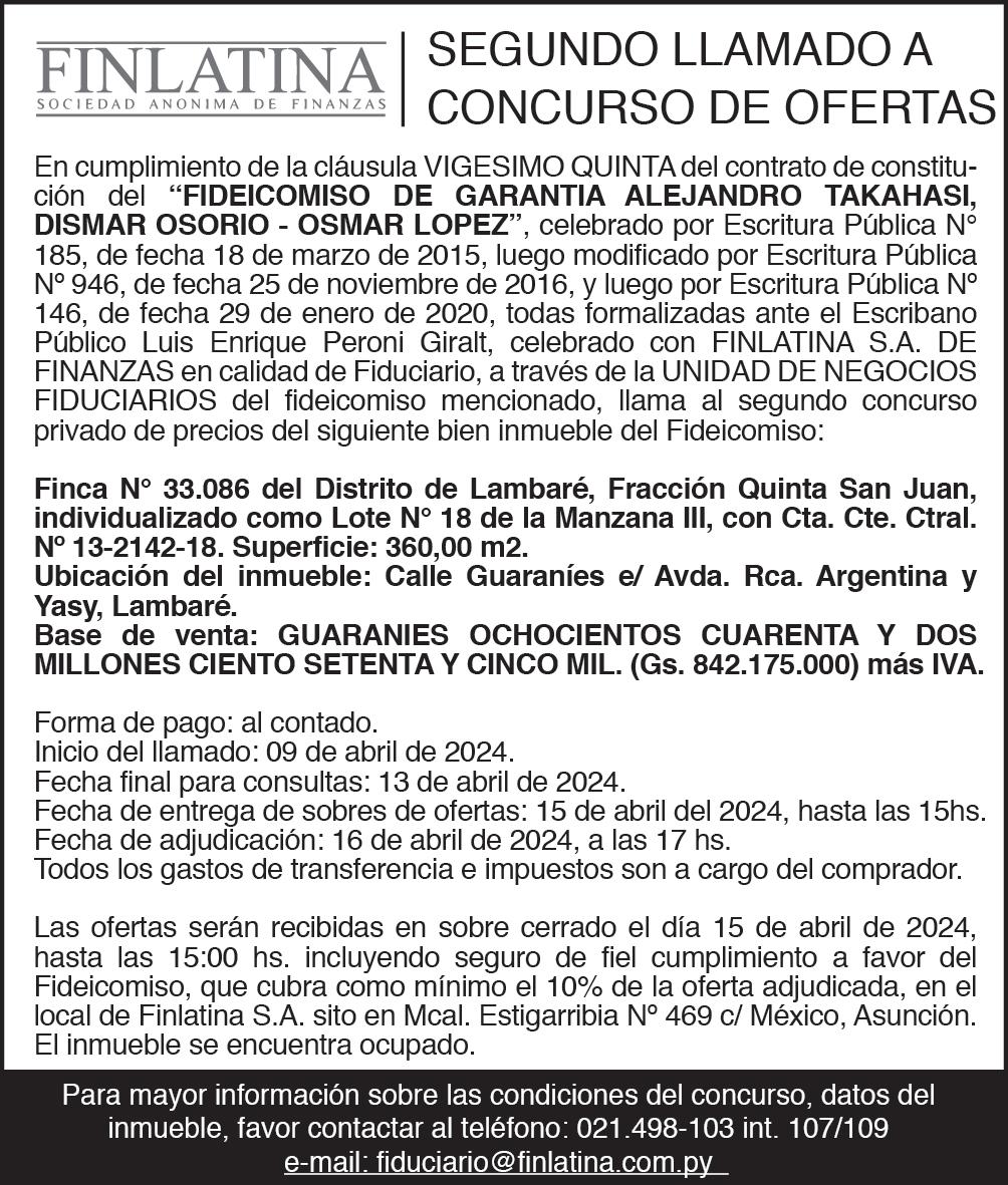 General Ordinaria que se realizará el día 22 de abril de 2024 a las 11:00 horas en su Local Social sito en la Ruta Gral. Elizardo Aquino Km. 11,5 de la ciudad de Luque, con el fin de tratar el siguiente Orden del Día: 1. Elección del Presidente y Secretario de Asamblea; 2. Lectura y consideración de la memoria del directorio, balance general, cuadro de ganancias y pérdidas e informe del síndico, correspondiente al ejercicio cerrado el 31 de diciembre de 2023; 3. Destino de Resultado; 4. Elección de Directores Titulares y Suplentes; 5. Elección de Síndico titular y síndico suplente para el ejercicio 2024; 6. Fijación de las remuneraciones para los miembros del directorio y síndicos; 7. Designación de un accionista para firmar el Acta de Asamblea, conjuntamente con el Presidente y Secretario de la Asamblea. Se recuerda a los Accionistas sobre lo dispuesto en el Art. 1084 del Código Civil con relación al depósito de las Acciones. Luque, 05 de abril de 2024.