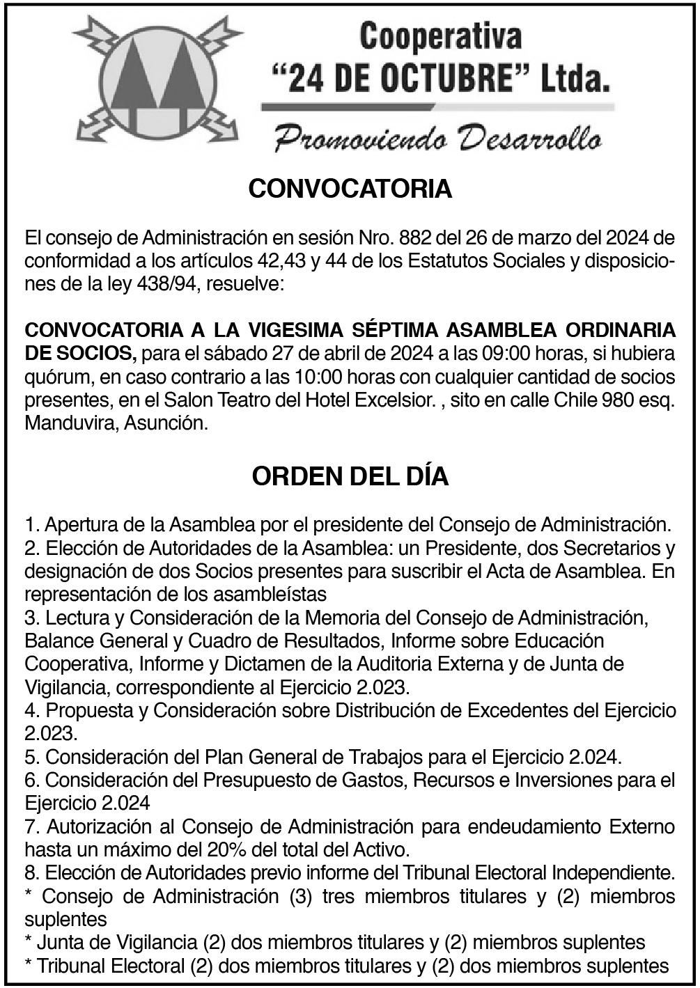 Accionistas a Asamblea General Ordinaria que se realizará el día 06 de mayo, a las 14:00 horas en primera convocatoria y a las 15:00 horas en la segunda convocatoria en el local Social de la Entidad sito Avda. Carlos Antonio López, Supercarretera de Pdte. Franco para tratar el siguiente orden del día: 1-Elección de un presidente y secretario de asamblea. 2-Lectura y consideración de la memoria del directorio, balance general, el cuadro de pérdidas y ganancias y el informe de la sindicatura, correspondiente al ejercicio, cerrado al 31 de diciembre del 2023. 3-Eleccion de los miembros del directorio y su remuneración. 4-Elección del síndico titular y suplente y su remuneración. 5-Tratamiento de distribución de utilidades y/o pérdida 6-Designación de los accionistas para la firma del acta de Asamblea. Se le recuerda a los señores accionistas a depositar sus acciones en la entidad 3 días antes de la asamblea para tener derecho a voz y voto. el accionista podrá hacerse representar ante la asamblea mediante carta poder con firma autenticada. El Directorio. 68770/24/04-