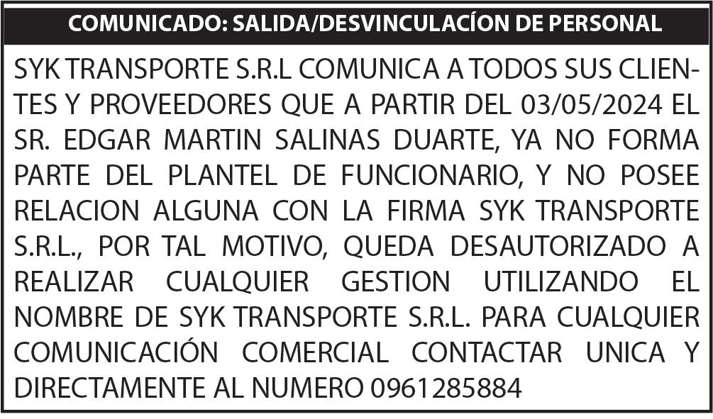 CONVOCATORIA A ASAMBLEA GENERAL ORDINARIA DE ACCIONISTAS. El Directorio de REMITEX PARAGUAY SOCIEDAD ANÓNIMA., convoca a los accionistas a la Asamblea General Ordinaria de Accionistas a realizarse en el domicilio social, sito en San Francisco 753 c/ Siria de la ciudad de Asunción, , el día 17 de mayo del año 2024 a las 14:00 hs. en su primera convocatoria y 16:00hs. en su segunda convocatoria ORDEN DEL DÍA: 1. Designación de un Presidente y un Secretario de la Asamblea. 2. Lectura y Consideración d la Memoria Anual del Directorio, Balance General, Informe del Síndico, Cuadro de Pérdidas y Ganancias al 31 de Diciembre de 2023. 3. Elección de Miembros del Directorio y Síndico. 4. Fijación de Remuneraciones de los Miembros del Directorio y Síndico. 5. Destino de los Resultados del Ejercicio 2023. 6. Designación de dos Accionistas para suscribir el Acta de Asamblea. NOTA: DEPÓSITO DE ACCIONES: Se recuerda a los señores accionistas que de conformidad al artículo 28 de los Estatutos Sociales, para poder tener derecho a voto en la Asamblea General Ordinaria de Accionistas, deberán depositar sus acciones en la Sociedad, con una anticipación no menor a 3 (tres) días hábiles a la fecha fijada para la celebración de la Asamblea o, en su defecto, deberán presentar un Certificado Bancario de Depósito de acciones dentro del plazo señalado. QUÓRUM LEGAL PARA SESIONAR EN PRIMERA CONVOCATORIA: Se recuerda a los accionistas lo dispuesto en el artículo 25 de los Estatutos Sociales sobre el quorum legal en primera convocatoria. En este sentido la Asamblea que-