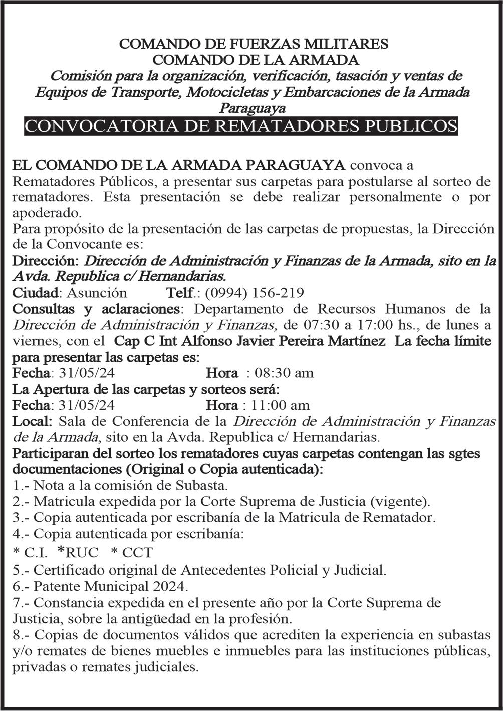 EDICTO. La Dirección General de Juzgado de Faltas de la DINATRAN, cita y emplaza por el término de cinco (05) días hábiles contados a partir del día siguiente a la última publicación, de conformidad a lo establecido en la Res. CD N° 228/2021, a los propietarios o tenedores de unidades de transporte en infracción, las que se detallan de la siguiente manera: OAU 111- BCV 098- ADA 113- BXG 388- BKP 841- BYS 316- BSJ 445- AKB 598ALN 516- AAOF 833- AAIA 478BYS 033- ALK 978- NBS 722AHZ 592- BPY 208- OBA 738- BAG 098- AFD 713- HDR 773- HAT 112- AABY 800- AAFA 158- ANE 869- WBNJ 963- BFT 728- AACA 534- AAIZ 479- OAX 725- OBH 110- NBR 215- AAFA 092- AADX 128- ADU 821AALV 806- ZAB 704- HAT 205AAAK 268- HAD 469- ABS 822WHDS 394- AOH 783- BTJ 747- BHL 497- BJG 725- XBB 007- CAN 224- OAP 919- AJC 186- XBR 376- AUS 849- OBE 758- BDY 297- AARJ 080AAND 048- , a que se presenten ante dicha dependencia sito en km. 14 ½ Ruta 2 “Mcal. Estigarribia”, 2do. piso, de la ciudad de San Lorenzo, a fin de ejercer su defensa técnica dentro del marco del procedimiento previo a la aplicación de sanciones establecidas en la Ley N° 1590/2000 y sus reglamentaciones. -70229/24/05.-