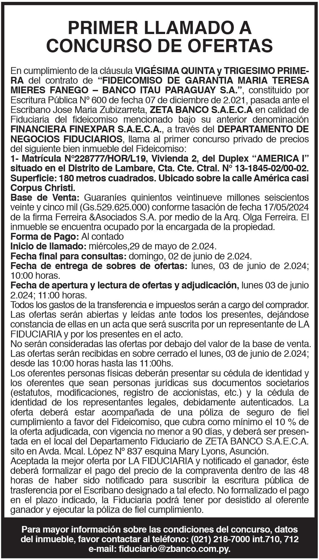 CIRCULAR DE MENSURA JUDICIAL. Comunico a quienes puedan tener interés y en especial a las partes linderas que el día 20 de Junio del año dos mil veinticuatro, a las 12:00hs. daré inicio a las operaciones técnicas de Mensura Judicial de una fracción de terreno, presumiblemente de origen fiscal individualizado como Lote N° 14-A-1 de la Manzana “F” de la colonia Itaipyte, Distrito de Itakyry. Propiedad del INDERT solicitado por el señor DANIELI MARTINA FETSCH, Exp. Adm. N° 6436/2024, R.P. N° 2867/2021 cuyos linderos son los siguientes: al Norte Linda con Calle, al Sur Linda con derechos del señor Oscar Adriano Farber; al Este Linda con derechos del señor Nicolau Justino de Sousa y al Oeste linda con derechos del señor Alfredo Gonzalez. El expediente se tramita ante al juzgado de primera Instancia en lo Civil y Comercial del Segundo Turno y Laboral, de Presidente Franco a cargo de la Jueza Abogada Cynthia Rossanna Pineda Morel Secretaría N° 2 a cargo de la Actuaria Judicial Abogada Norma Bodenser. Expediente Judicial N° 122, del año 2024. Las mediciones arrancaran del esqui-
