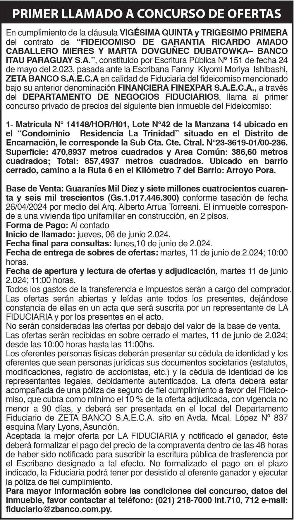 CONVOCATORIA DE ACREEDORES. EL JUEZ DE PRIMERA INSTANCIA EN LO CIVIL, COMERCIAL, LABORAL, NIÑEZ Y ADOLESCENCIA DE LA CIUDAD DE CAPITÁN BADO DE LA CIRCUNSCRIPCIÓN JUDICIAL DE AMAMBAY, ABG. CRISTHIAN ARIEL SÁNCHEZ ZARACHO; en los autos caratulados: “LIZ MARLENE ZARATE CARRILLO S/ CONVOCATORIA DE ACREEDORES” EXPTE N° 110, FOLIO 81, AÑO 2.024, ha dictado el A.I. Nº 141 de fecha 05/06/2024, en la cual se ordena la publicación por cinco días, haciendo saber la ADMISION de esta CONVOCATORIA. Dicha acción es promovida por ante la Sec. Nº 01 a cargo del Actuario Judicial, Abog. Carlos Rubén Martínez Giménez. - CAPITAN BADO, 5 de junio de 2024.-71013/10/06.-
