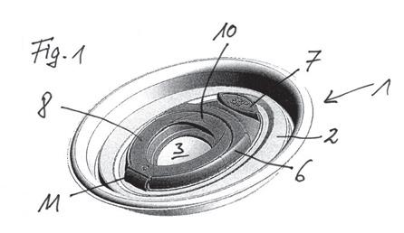 2593/05 que modifica el Artículo 23 De publicaciones de la Ley N° 1630/00 de Patentes de Invención, se dispone que a partir de la fecha de la presente orden de publicación, esta solicitud de patente se hace pública y se ordena su publicación por el término de la Ley. (57) Resumen: (160/19). Tapa de lata metálica con una abertura que se puede volver a cerrar, en particular para latas de bebidas así como para recipientes para almacenar productos alimenticios y otros productos líquidos, pastosos, en polvo o sólidos, con un microespacio (4), o línea de debilitamiento, previsto en la superficie de tapa metálica, alrededor de la abertura, un marco de estanqueidad (5) de material de plástico unido a la superficie de tapa fija (2) y que rodea el área de apertura, una unidad de cierre (6) de material de plástico unida al área de tapa metálica abatible (3) situada en el interior del microespacio (4) o la línea de debilitamiento, que está colocada en la superficie de tapa fija (2) de manera que puede pivotar alrededor de un cojinete giratorio (7) y provista preferentemente de un elemento de apertura por rasgado (8), que, diametralmente opuesto al cojinete giratorio (7), está unido a la unidad de cierre (6) de manera abatible, en donde el marco de estanqueidad (5) y la unidad de cierre (6) cooperan, preferentemente a través de nervaduras de estanqueidad y encastre (12, 13, 14) y correspondientes ranuras de alojamiento (15, 16, 17), de manera que crean una estanqueidad y el área de tapa metálica (3) situada en el interior del microespacio (4) o la línea de debilitamiento circundante está alojada y retenida en el área de apertura de la tapa (1), en donde el marco de estanqueidad (5) está unido a la superficie de tapa sólida (2) y la unidad de cierre (6) está unida al área de tapa metálica abatible (3) por unión de materiales, en particular mediante un procedimiento térmico utilizando una capa de barniz adhesivo preferentemente de calidad alimentaria y/o que presente propiedades lubricantes, y en donde la cara interior de la tapa, al menos en gran parte, excepto por una capa de barniz eventualmente prevista, está libre de laminaciones y similares. Farm. Berta Segovia Directora Interina Dirección de Patentes. -70970/10/06.-