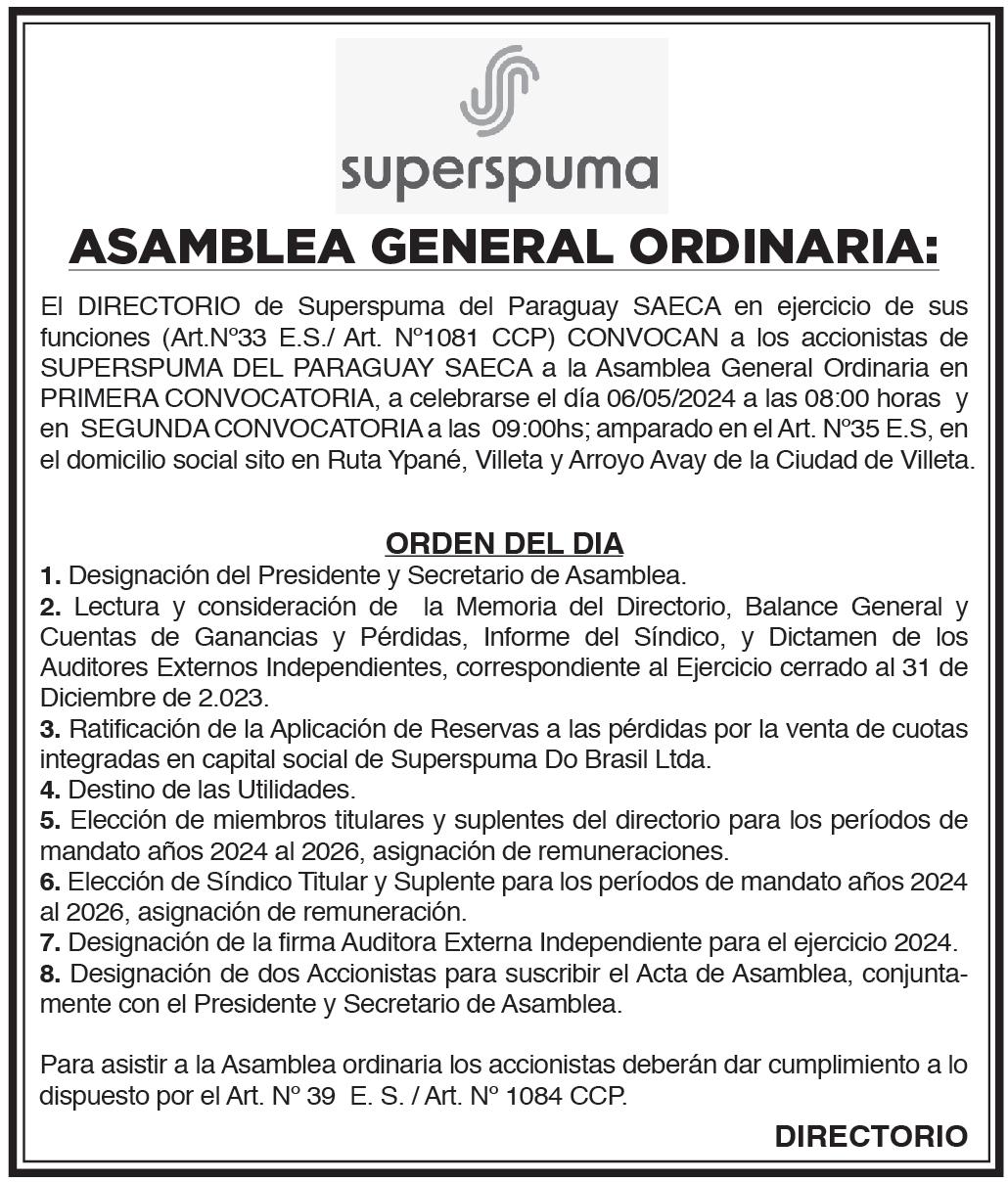 ASAMBLEA GENERAL ORDINARIA. Convocase a los Accionistas de la firma SER PARAGUAYO S.A. a Asamblea General Ordinaria a llevarse a cabo el día 13 de mayo del 2024 a las 14:00hs., en el