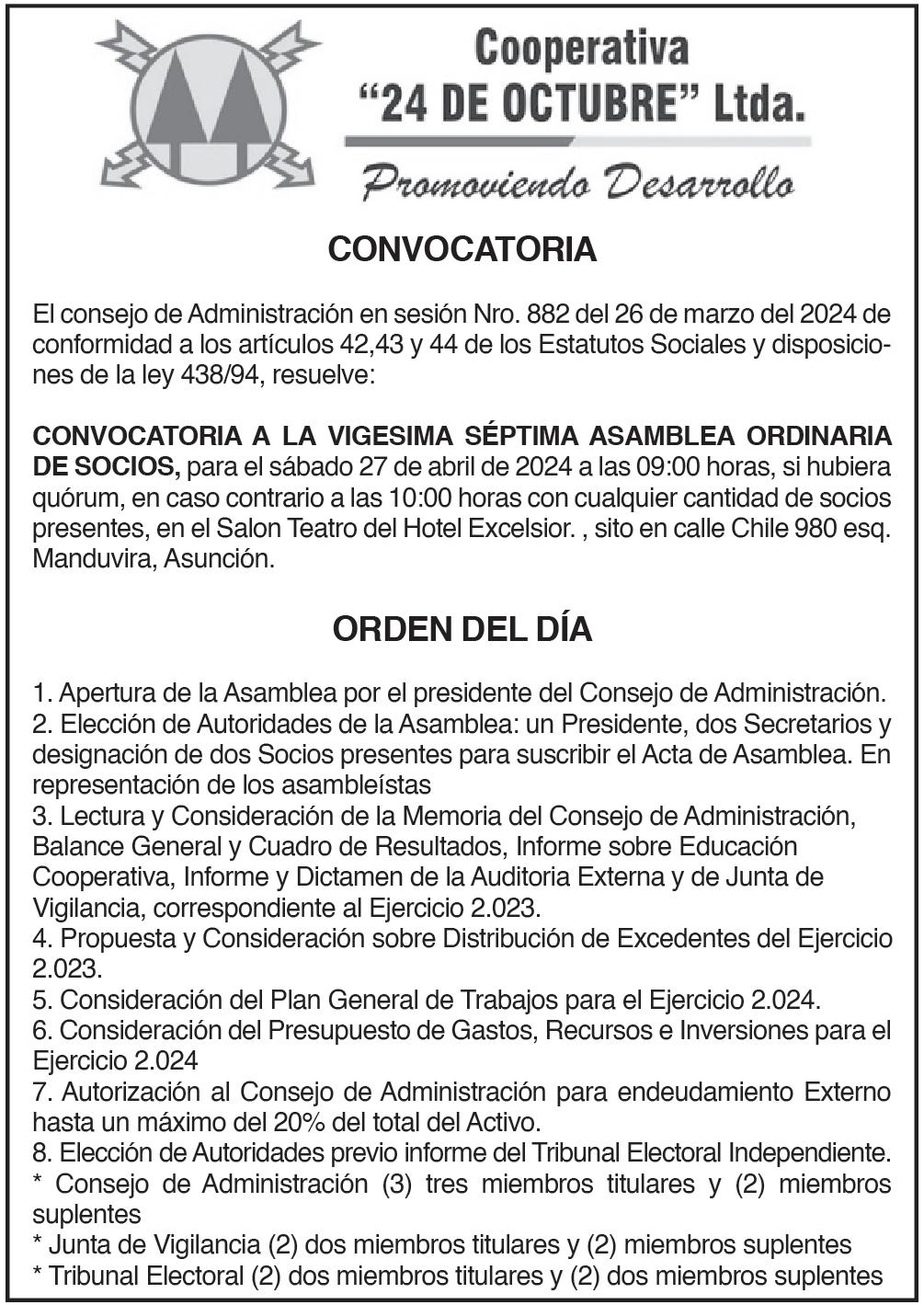 ASAMBLEA GENERAL ORDINARIA. El Directorio de GANADERA AGROINDUSTRIAL AURORA SA convoca a ASAMBLEA GENERAL ORDINARIA Para el día 4 de mayo de 2024 a las 10:00 y 11:00 en primera y segunda convocatoria, en su sede social de la Avda. Costanera y Ángel Samudio de la ciudad de Encarnación para tratar el siguiente orden del día: 1-Elección del Presidente y Secretario de Asamblea. 2-Lectura y consideración de la Memoria del Directorio, Informe del Síndico, balance general, cuadro de resultados, y Anexos. Y Distribución de utilidades correspondientes al ejercicio 2023. 3-Elección de Directores y Síndicos y fijación de su retribución. 4-Elección de dos socios para suscribir el Acta. Se recuerda a los socios lo referido en el art. 1084 del código civil paraguayo y su homólogo en el estatuto social. El Directorio. 68818/27/04-