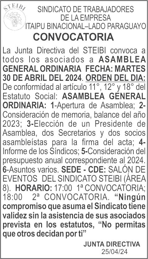 19/05/2024 a las 8:00 horas (primera convocatoria) en el local Sindical, sitio en la avenida Bernardino Caballero San José, para tratar el siguiente ORDEN