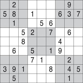 Los rompecabezas de sudoku consisten en cinco cuadrículas de sudoku superpuestas. Las reglas estándar de sudoku se aplican a cada cuadrícula de 9 x 9. Coloque dígitos del 1 al 9 en cada celda vacía. Cada fila, cada columna y cada cuadro de 3 x 3 debe contener uno de cada dígito.