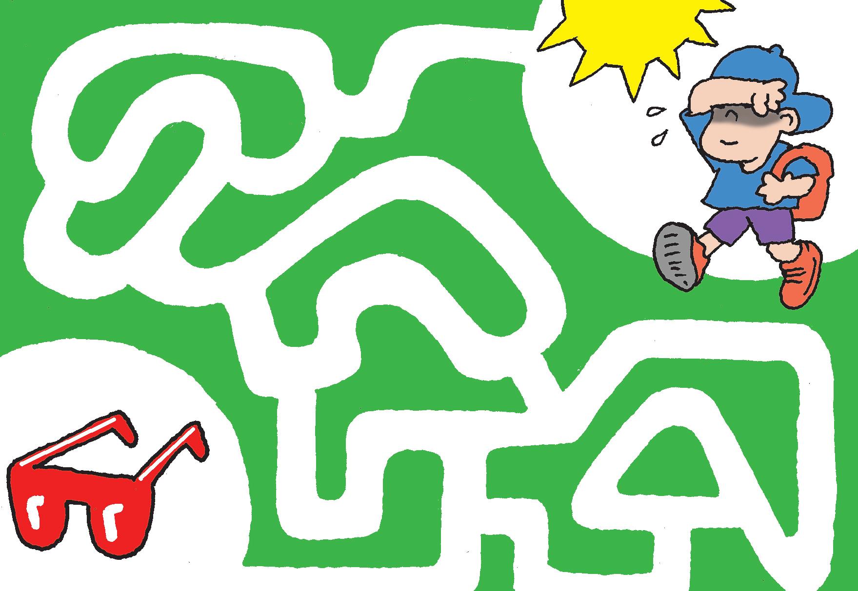 El brillo del sol está fuertísimo...y justo Edu salió a dar una caminata por allí. Y olvidó sus anteojos de sol. Encuentra el camino más corto para llegar hasta sus anteojos.