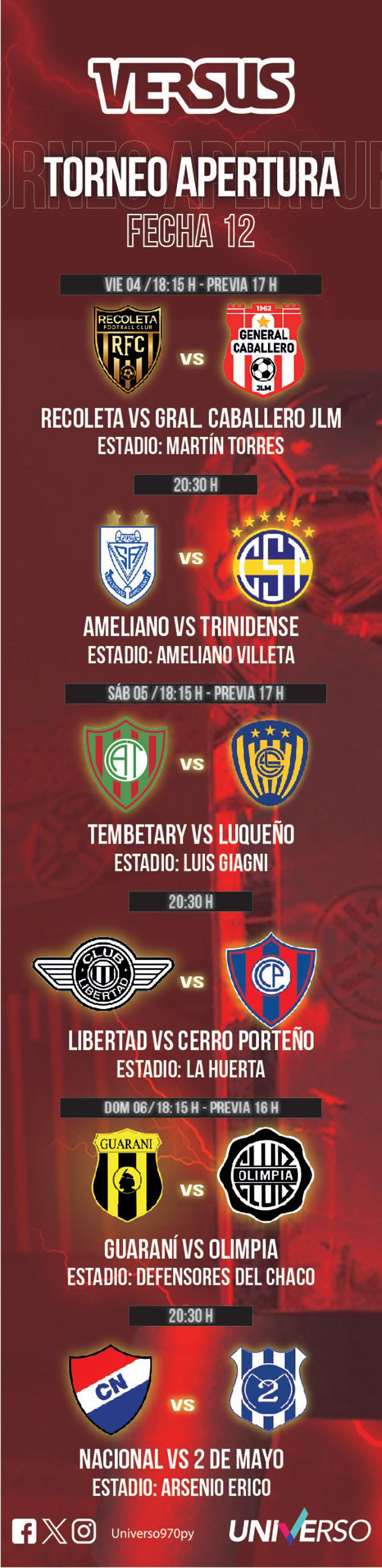 Ameliano y Sportivo Trinidense en Villeta. Los locales no pudieron sostener el resultado en la fecha anterior ante Luqueño y cedieron el empate, por lo que están obligados a sumar de local, mientras que Trinidense consiguió una gran victoria ante el pintado Guaraní.