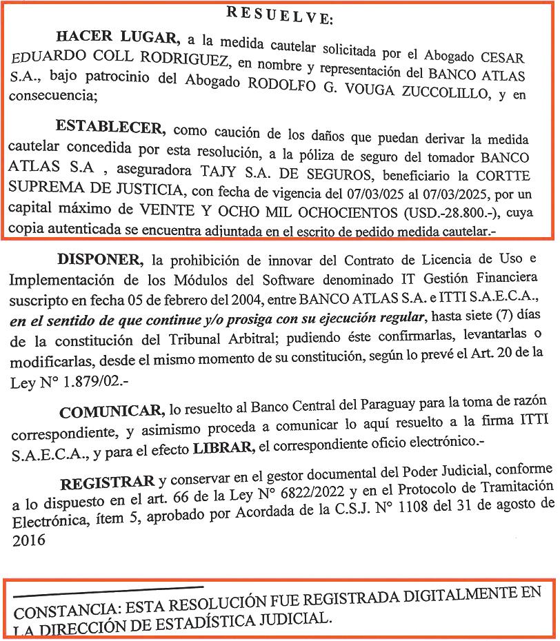 Lo llamativo es que la medida cautelar fue otorgada sin siquiera haberse iniciado el proceso arbitral que está contemplado en el contrato, tal como el mismo magistrado trajo a colación en su resolución. El banco de la familia Zuccolillo puede seguir operando gracias a esta medida cautelar, la cual tiene una vigencia temporal de siete días luego de iniciado el proceso arbitral. De quedar sin efecto, inmediatamente Atlas quedaría sin licencia para seguir operando su software matriz.