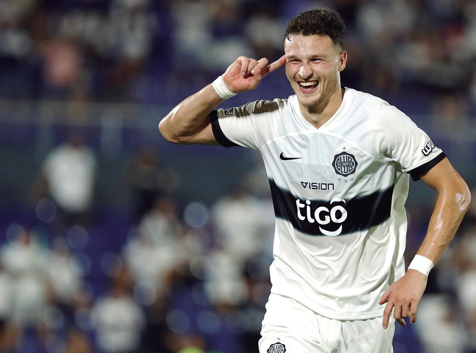 Facundo Bruera y su gesto característico cuando convierte goles. El delantero argentino ingresó en el segundo tiempo y le dio el triunfo a Olimpia