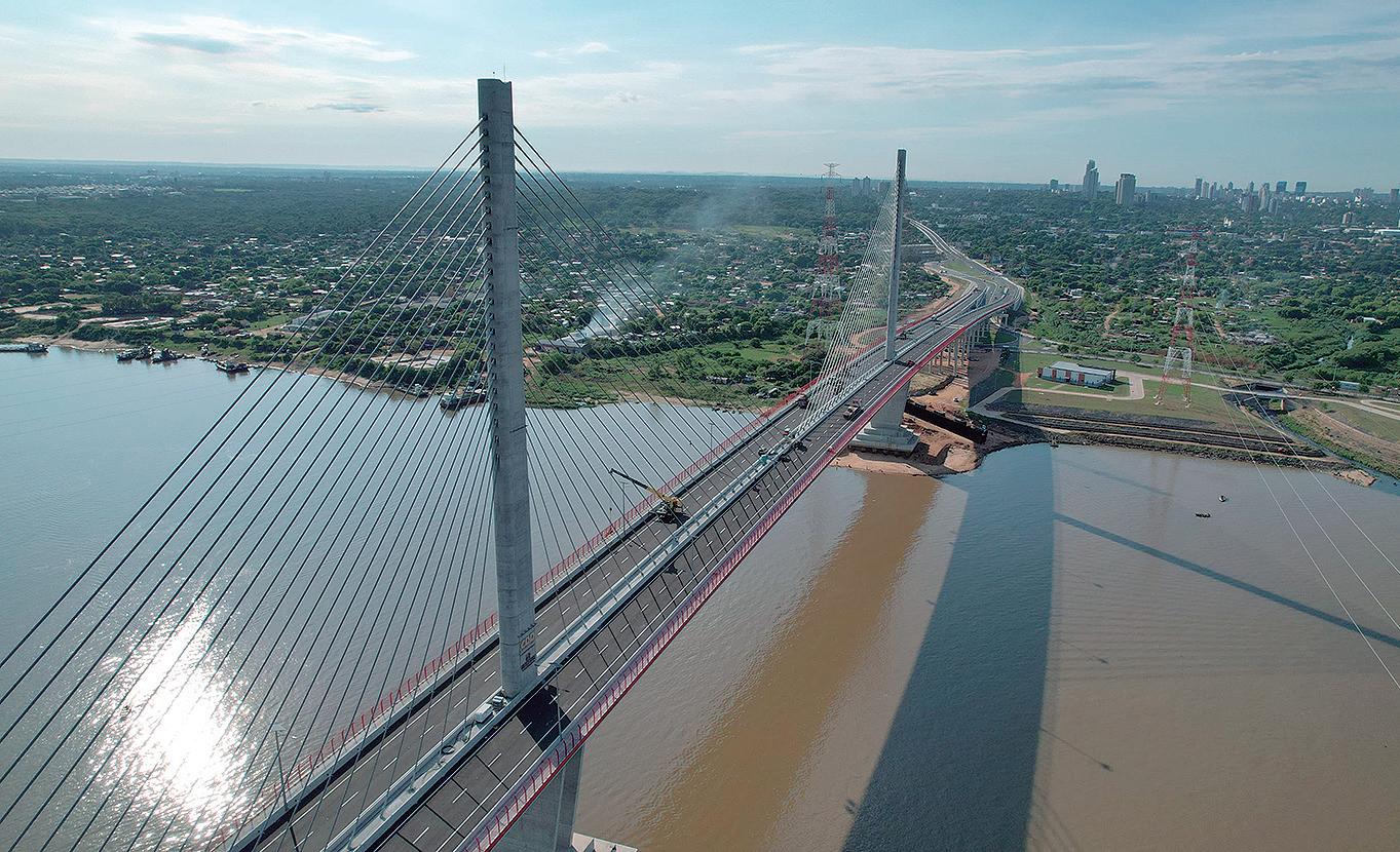 tiene actualmente sobre el puente Remanso. El atirantado sobre el río Paraguay, tiene 603 metros y cuenta con dos pilas de 300 metros cada una con dos velas sujetadas por 23 tirantes de cada lado, y es el primer puente que tendrá 4 carriles para el tránsito vehicular, vereda peatonal y bicisenda.