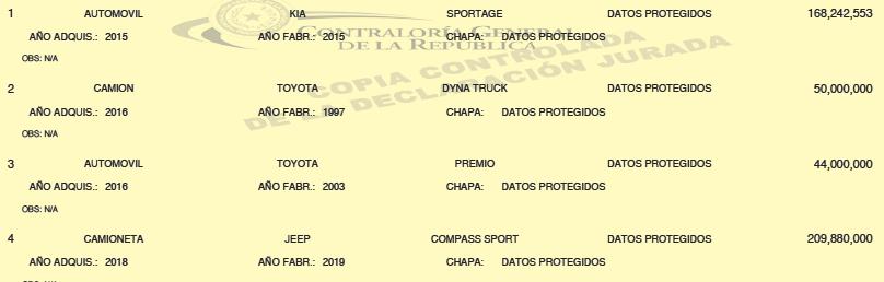 El joven mimado ya había dejado atrás el Toyota Spacio para declarar una camioneta Jeep Compass modelo 2019 de G. 209.880.000, adquirida ese mismo año; otra camio neta Kia Sportage modelo 2015 que también adquirió 0 km por G. 168.242.553, un auto Toyota Premio 2003 valorizado en G. 44.000.000 y un camión Toyota Dyna Truck de G. 50.000.000. A los 28 años, la flota de vehícu los de Ibáñez ya consistía en cuatro rodados valorizados en total en G. 472.122.553.