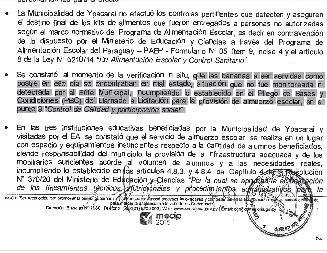 Un informe de fiscalización especial realizada por la Contraloría General de la República a la Municipalidad de Ypacaraí de marzo pasado revela incumplimientos de puntos claves del pliego de bases para la contratación del almuerzo escolar, falta de documentos que respalden el suministro, mala calidad de frutas, etc.