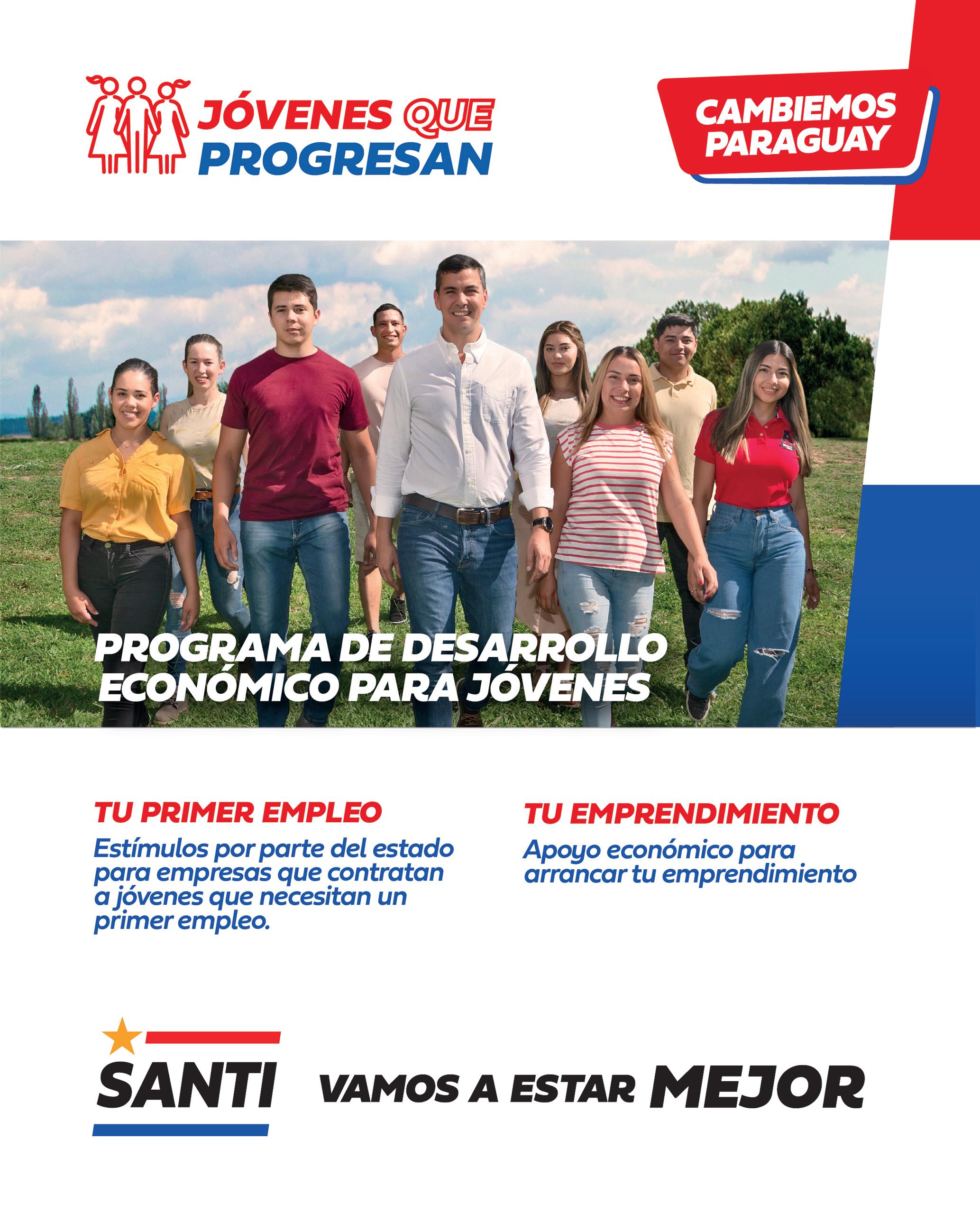 les socioeconómicos, entre sus estrategias Santiago Peña indicó las siguientes: “Gestionaré el acceso a créditos blandos, programas de refinanciamiento, menos burocracia y lo más importante mejorar la economía para que la gente tenga plata en el bolsillo y los pequeños negocios puedan vender