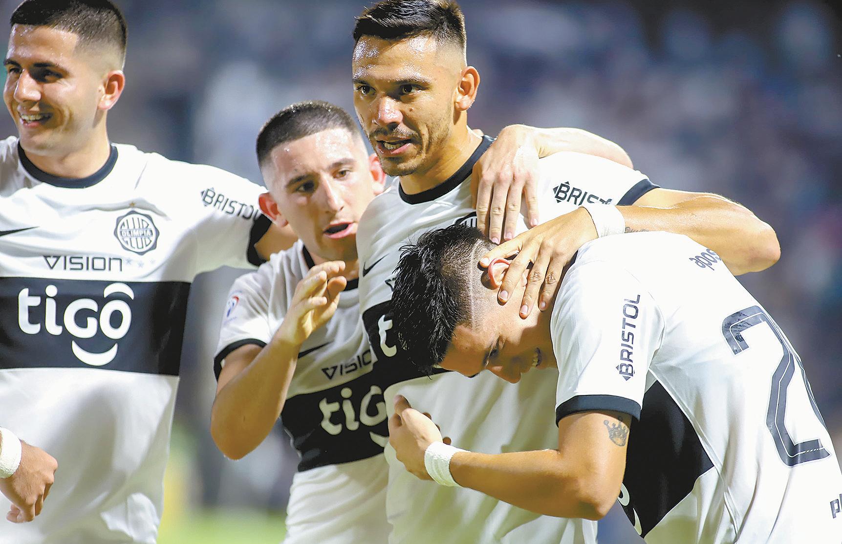 Manuel Romero, autor del segundo gol franjeado, recibe las felicitaciones de Walter González y Facundo Zabala. Olimpia logró una sufrida victoria sobre General Caballero