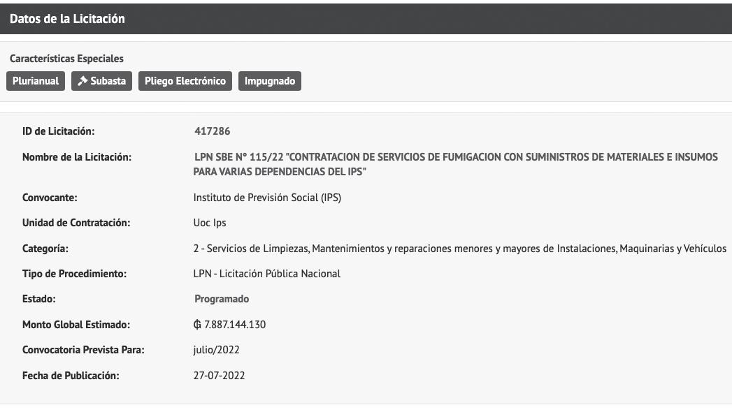 el desembolso de G. 7.887 millones para la contratación de un servicio de exterminación de plagas en distintas sedes del IPS, en el cual se exige que los oferentes posean un dispositivo electrónico, detector de termitas (kupi’i), requisito no visto en ninguna otra licitación publicada en el portal de la DNCP.