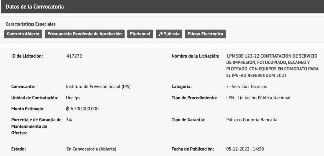 La licitación para la “Contratación de servicio de impresión, fotocopiado, escaneo y ploteado, con equipos en comodato para el IPS”, se publicó en el portal de la DNCP el pasado 5 de diciembre bajo la modalidad “Ad Referéndum” ya que, tal como se indica en los datos de la licitación, la fuente de financiamiento para esta contratación aún no fue definida. ¿Será que ya están pensando en el megapréstamo de US$ 240 millones con riesgo para los fondos jubilatorios?