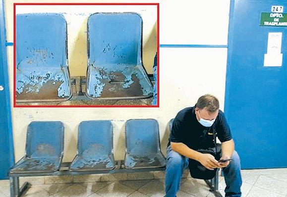 Otro ejemplo de la indiferencia en el trato a los asegurados es el estado de las salas de espera, específicamente en el servicio de urgencia del Hospital Central del IPS donde los pacientes enfermos deben aguardar durante horas sentados en bancos en pésimo estado tal como que se ve en la fotografía. Sillas con base de metal rota, y la pintura visiblemente desgastada, un asiento listo para cortar con riesgo de infectar a cualquier paciente desafortunado.