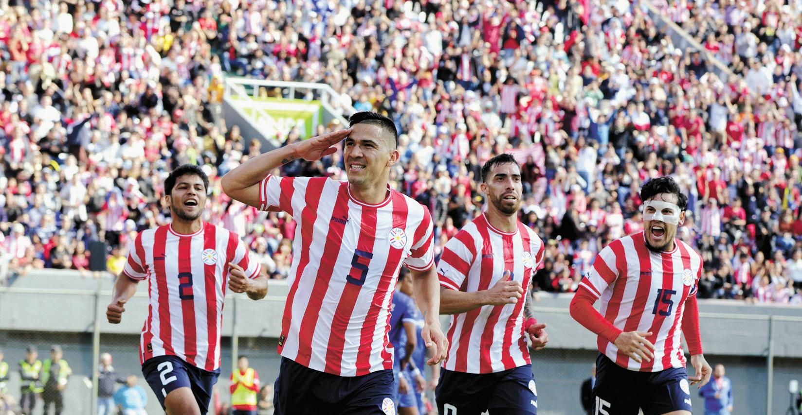 El Comandante Fabián Balbuena saluda al público tras convertir un gol para la Albirroja en el estadio Defensores del Chaco. Robert Rojas, Gabriel Ávalos y Gustavo Gómez se asocian a la alegría