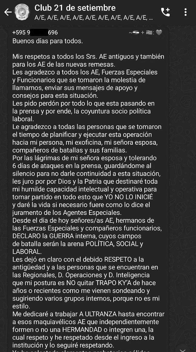 el agente especial realice un descargo en un grupo de Whatsapp donde se encuen tran miembros de élite de la institución.