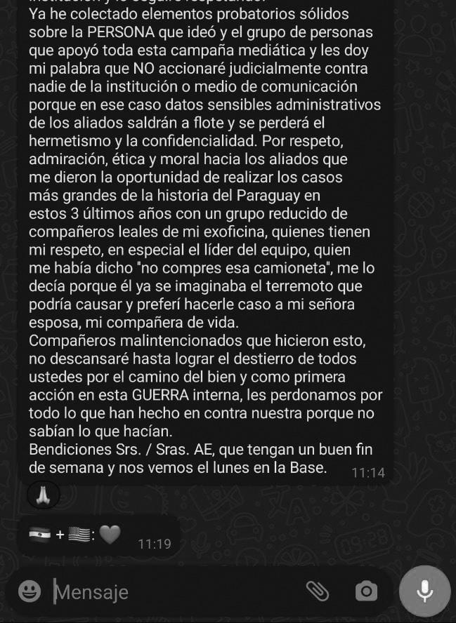 Chamorro Portillo se descargó en Whatsapp venti lando guerra “política, social y laboral” interna en la Senad y dice que colectó pruebas contra supues tos soplones que filtraron compra de su lujosa camioneta a la prensa. Esto es gravísimo teniendo en cuenta su acceso a datos de inteligencia y que su esposa Berenicce es analista del SIU.