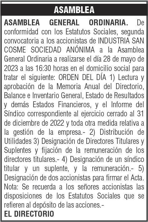 TRANSCRIPCIÓN DE ACTAS. TONINA SOCIEDAD ANONIMA : TRANSCRIPC. de ACTAS DE ASAMBLEAS GRALES. EXTRAORD. y ORDIN. de ACCIONISTAS.= (Modif. Art Nº. 5º).= E. P. Nº. 35 (08/03/2023).
