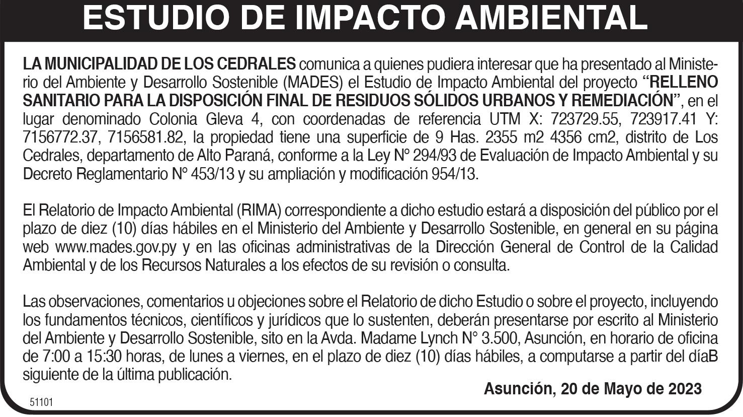 sión de: "MARCIANO SERVIN CACERES s/ SUCESION AB-INTESTATO - AÑO 2023 - N° 20 - FOLIO 2". El Expediente se encuentra en la Secretaría del Juzgado de Paz de la ciudad de Dr. Juan Manuel Frutos. Dr. Juan Manuel Frutos, 16 de mayo de 2023. Ante mí: JUAN JOSE SILVERO GONZALEZ. Secretario. 51022/28/05SUCESIÓN. EL JUEZ DE PRIMERA INSTANCIA EN LO CIVIL Y COMERCIAL DEL TERCER TURNO DE LA CIRCUNSCRIPCION JUDICIAL DE AMAMBAY, Abg. SANDRO ISMAEL VERA ORTIZ, cita y emplaza por sesenta días a los herederos y acreedores de la sucesión de JUAN MANUEL BENITEZ PEREZ , MARCELINA DAVALOS DE BENITEZ, que radica en la Secretaría N.º 06 a cargo del Actuario Judicial Abg. FREDY FERNANDO MOLINAS DESVARS. Pedro Juan Caballero, 13 de abril de 2023. 51019/28/05SUCESIÓN. EL JUEZ DE PRIMERA INSTANCIA EN LO CIVIL Y COMERCIAL DEL TERCER TURNO DE LA CIRCUNSCRIPCION JUDICIAL DE AMAMBAY, Abg. SANDRO ISMAEL VERA ORTIZ, cita y emplaza por sesenta días a los herederos y acreedores de la sucesión del Sr. LEONOR VILLALBA AGÜERO, que radica en la Secretaría N.º 05 a cargo del Actuario Judicial Abg. PEDRO B. BENITEZ NOGUERA. Pedro Juan Caballero, 8 de mayo de 2023. 51021/28/05-