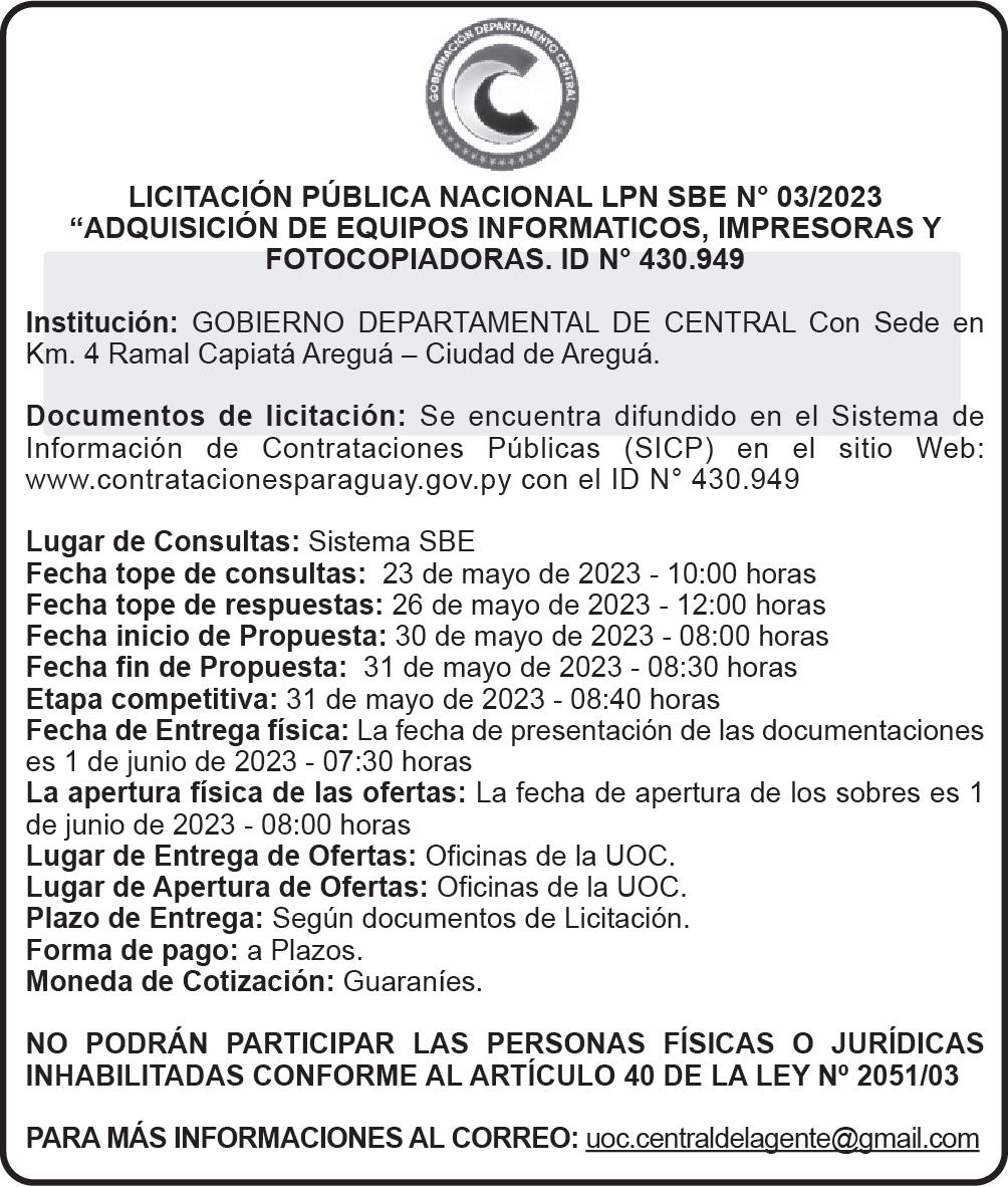 SUCESION. EL JUEZ DE PAZ EN LO CIVIL Y COMERCIAL DE LA CIUDAD DE DR. JUAN LEÓN MALLORQUÍN, ABOG. HÉCTOR PASTOR IBARRA GONZÁLEZ, CONFORME A LA LEY 6059/2028, CITA Y EMPLAZA POR SESENTA (60) DÍAS A HEREDEROS Y ACREEDORES DE LA SUCESIÓN DE MARIO ANTONIO GARCIA , CON C.1. N° 1.101.973. DR. JUAN LEÓN MALLORQUÍN, 16 DE MAYO DE 2023. ABG. ROBERTO TRINIDAD ESCOBAR (ACTUARIO JUDICIAL). 50893/26/05SUCESION. EL JUEZ DE PAZ EN LO CIVIL Y COMERCIAL DE LAMBARÉ, DR. JOSÉ SEGUNDO VELÁZQUEZ ALFONSO, CITA Y EMPLAZA POR SESENTA DÍAS A HEREDEROS Y ACREEDORES DE LA SUCESIÓN DE VICTOR JARA JARA S/ SUCESION. LAMBARÉ, 12 DE MAYO DE 2023. ABOG. HUGO MOLINAS DURE – ACTUARIO JUDICIAL – SECRETARIA N° 2. 50899/26/05SUCESION. LA JUEZ DE PRIMERA INSTANCIA EN LO CIVIL, COMERCIAL Y LABORAL DE LA TERCERA CIRCUNSCRIPCION JUDICIAL DE LA REPUBLICA, ; ABG. R. EVELIN CABRERA PAREDES, CITA Y EMPLAZA POR SESENTA DÍAS A HEREDEROS Y ACREEDORES DE LA SUCESIÓN DE MARIA ESTHER GUILLEN DE LOPETEGUI . EL JUICIO RADICA EN LA SECRETARÍA N° 02 A MI CARGO ABG. MIRIAN ORTIZ YURTZ, ACTUARIA JUDICIAL. MARIA AUXILIADORA, 18 DE ABRIL DE 2023.-SE HACE SABER AL DESTINATARIO DE ESTE EDICTO QUE EL MISMO CUENTA CON EL CÓDIGO QR, POR LO CUAL, PARA