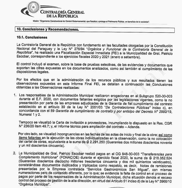 Un total de G. 2.196 millones en la eje cución de gastos en la Municipalidad de Gene ral Patricio Escobar fueron cuestionados en una fisca lización especial inmediata (FEI) realizada por la Con traloría General de la Repú blica (CGR). El informe con tiene 27 observaciones que ponen bajo la lupa a la actual intendenta, María Cristina Espínola, considerando que su equipo político se adju dica las irregularidades en uso de fondos de la comuna.