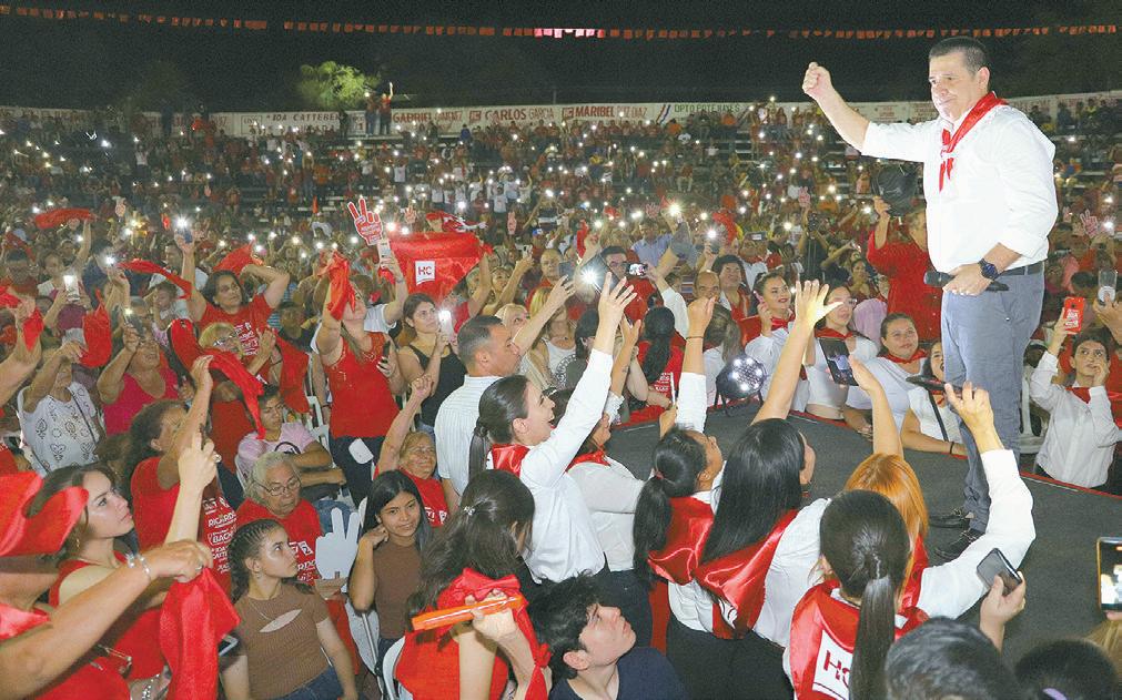 En medio de un multitudina rio acto de cierre de campaña en Villa Hayes de la chapa pre sidencial de Honor Colorado, Santiago Peña y Pedro Alliana, el precandidato a gobernador de Presidente Hayes, Ricardo Núñez, y la precandidata a diputada por Presidente Hayes, Ida Cattebeke, mani festaron su apoyo total al pro yecto de gobierno.