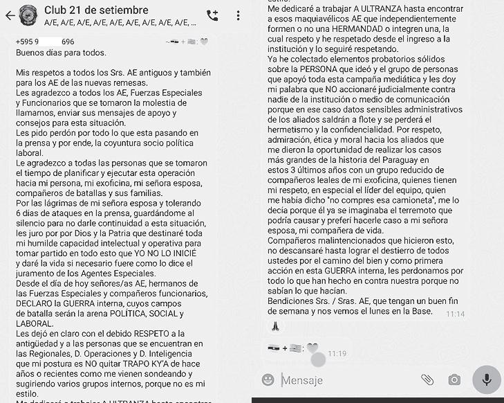 Volviendo al chat filtrado del agente especial Chamorro, que fue expulsado de la SIU tras las publicaciones sobre su meteórico ascenso patrimo nial, en medio de su declara ción de guerra interna señala que por “respeto” no ventilará los “trapo ky’a” (trapos sucios, alusivos a presuntas irregula ridades de otros funcionarios de la Senad) como le sondean.