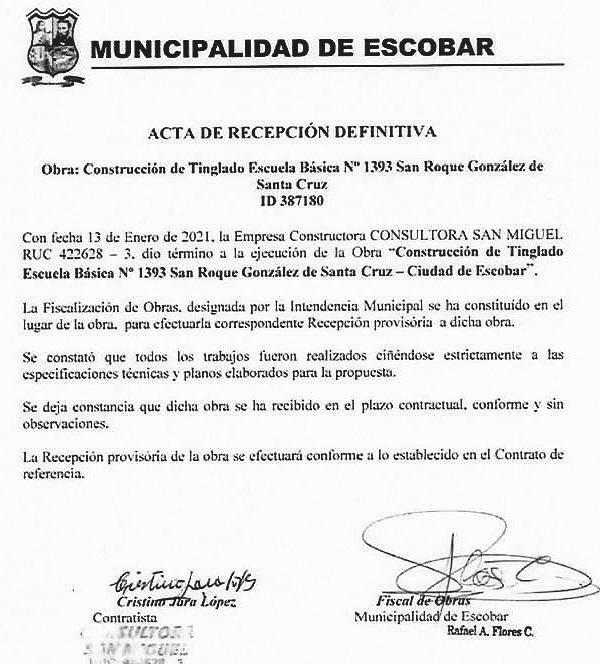 nida se encuentra un acta de recepción definitiva de esta obra. Dicho documento tiene fecha del 31 de enero del 2021 y está firmado por el fiscal de obras, Rafael Flores, y por Cristino Jara, quien es propietario de la constructora contratada, Consultora San Miguel.