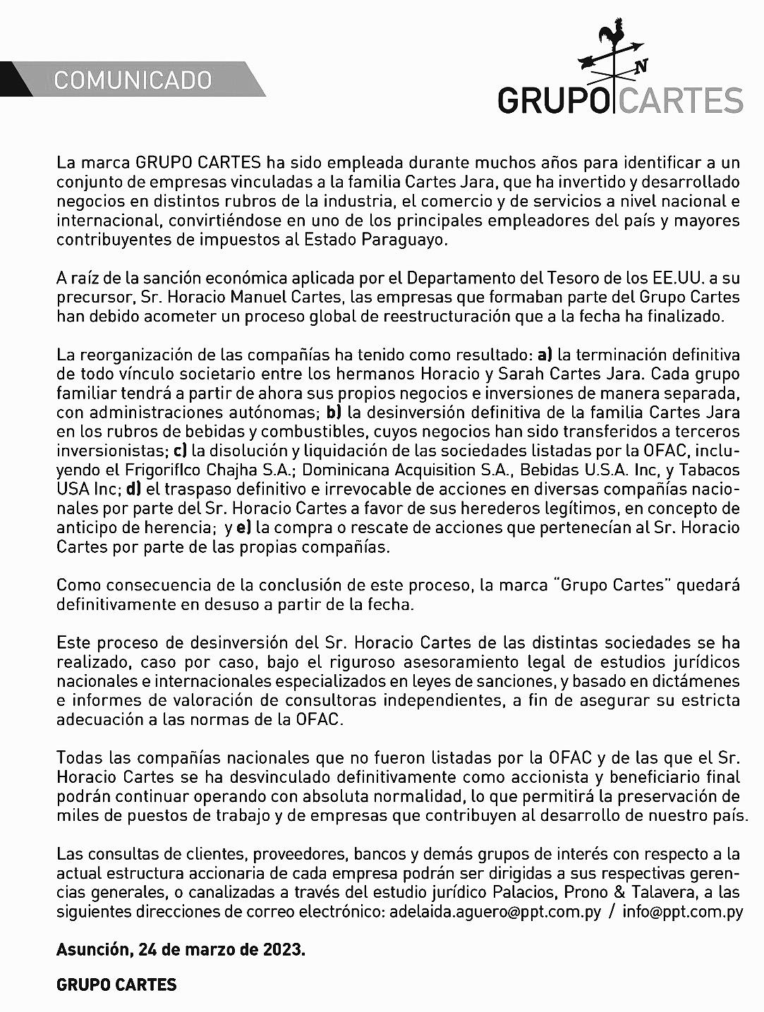 “Me despido para proteger puestos de mis compañeros”, señaló Horacio Cartes en un mensaje en el que anunció la finalización del proceso de reestructuración empresarial.