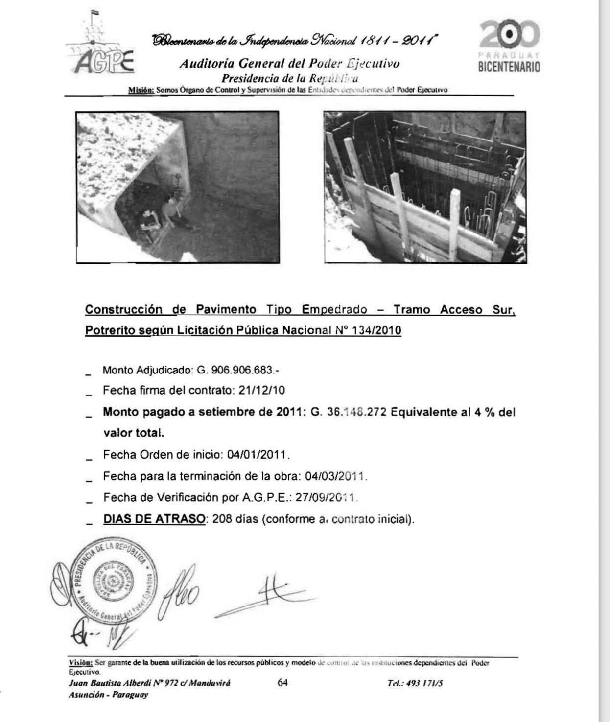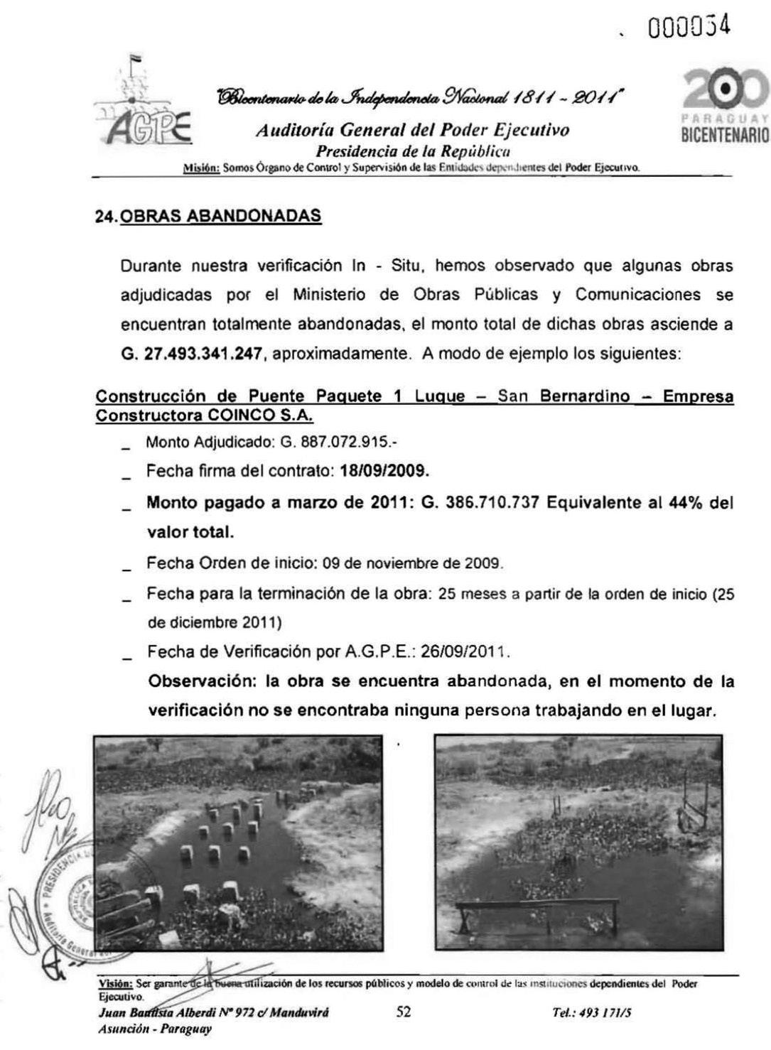 valente a G. 274 millones de los G. 541 millones adjudicados y estaba previsto que se termine en febrero del 2011. Sin embargo, en setiembre del 2011 se constató que la obra estaba abandonada. Un mes después, mediante un informe, la Dirección de Planificación Vial informó que los trabajos concluyeron.
