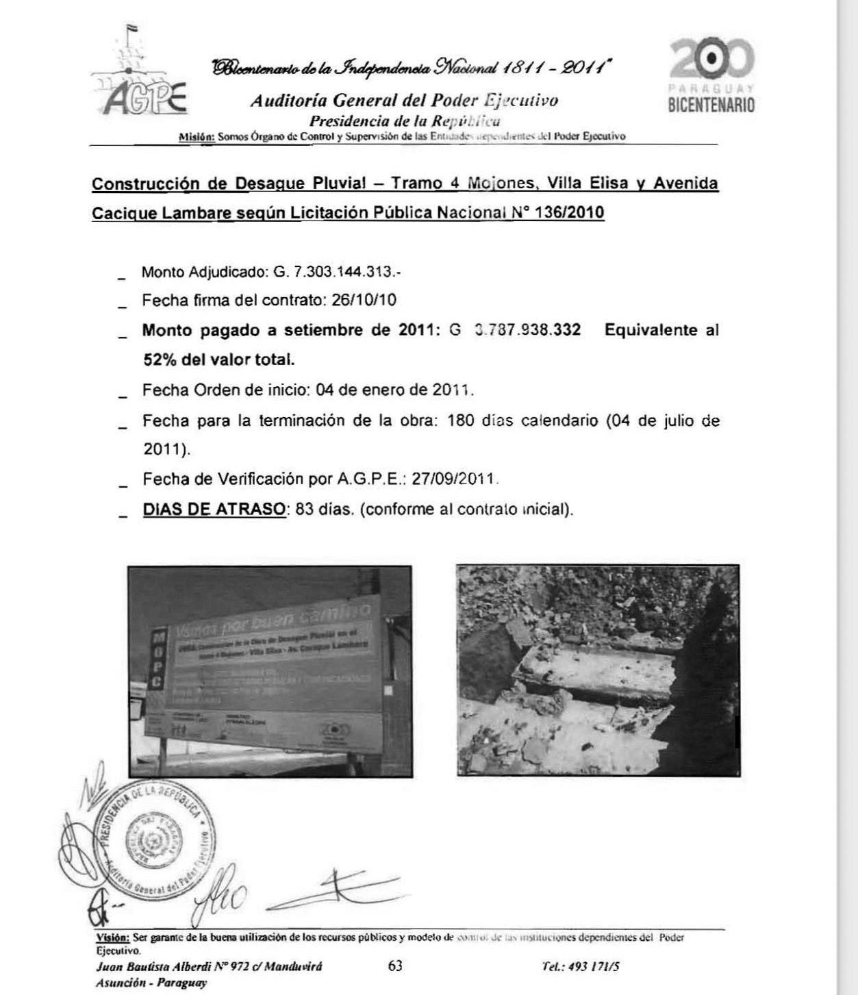 El desagüe pluvial del tramo 4 Mojones-Villa Elisa-Avenida Cacique Lambaré debía estar listo en julio del 2011; pero al verificarse en setiembre de ese año, aún no estaba concluida la obra por la cual se pagó el anticipo de G. 3.787 millones de los G. 7.303 millones adjudicados.
