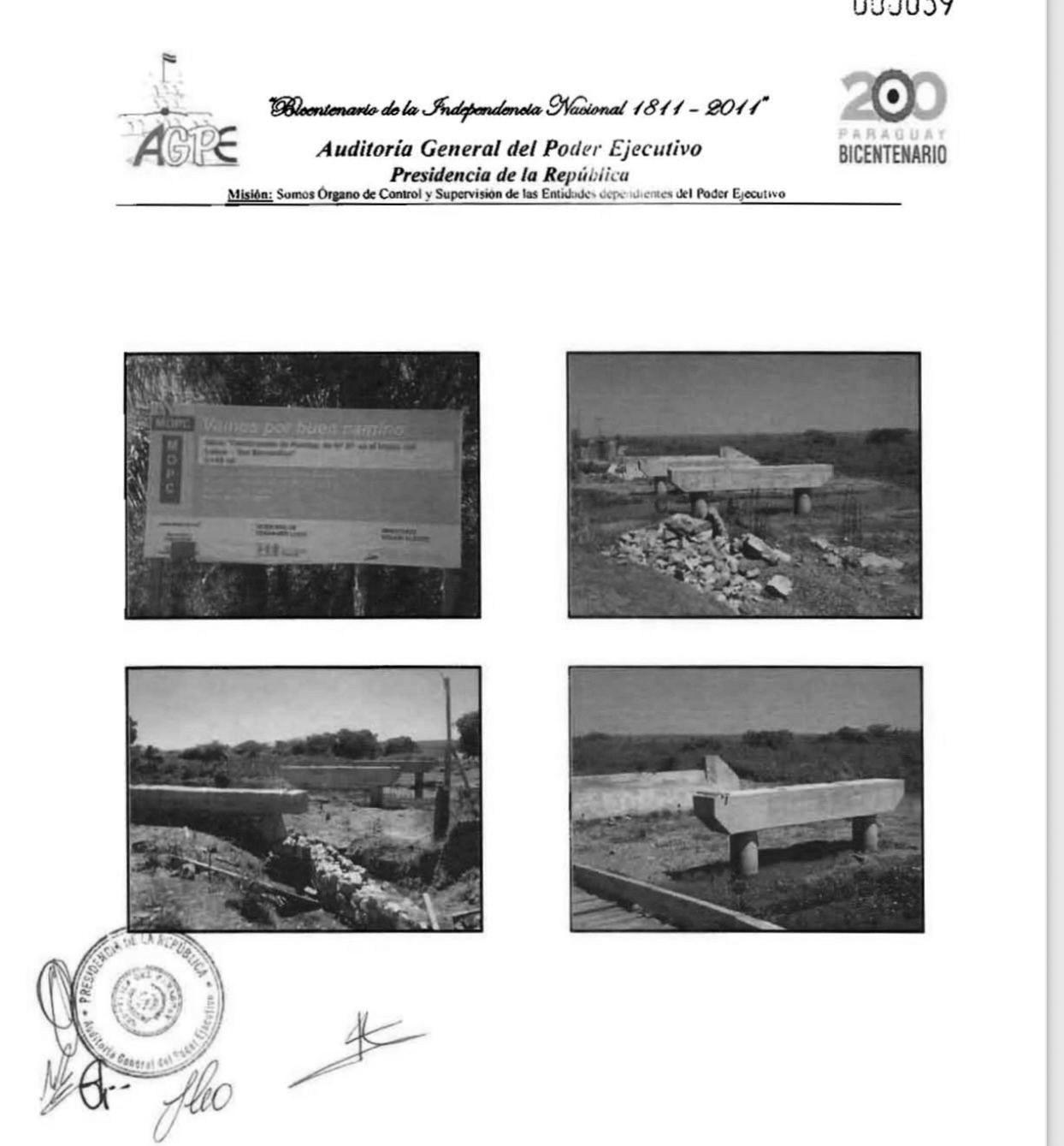 El puente en Luque-San Bernardino, por el cual se pagó en marzo del 2011 la suma de G. 386 millones, de los G. 887 millones adjudicados. El contrato se firmó en setiembre del 2009 y debía estar listo en diciembre del 2011; pero al verificar en setiembre del 2011, ninguna persona estaba trabajando en el sitio.