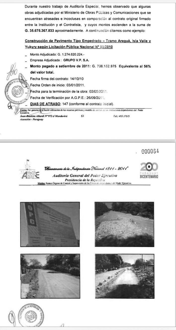 El caso más escabroso que figura en el informe es la rehabilitación y pavimentación asfáltica del tramo Caaguazú-Yhú-Vaquería, cuyo monto adjudicado fue de G. 69.713 millones y se desconoce la fecha exacta de la firma del contrato. Según el informe confidencial, durante la verificación in situ los intervinientes detectaron que la obra estaba paralizada pese a que la contratista Cotafel había recepcionado pagos hasta marzo del 2011 por G. 32.042.670.919, equivalente al 46% del valor total. Es decir, se llegó a pagar un millonario anticipo de US$ 7,5 millones por hacer absolutamente nada.